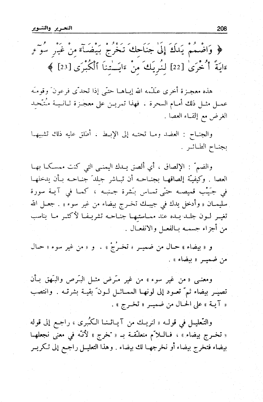 وَالتَّعْلِيلُ فِي قَوْلِهِ لِنُرِيَكَ مِنْ آياتِنَا الْكُبْرى رَاجِعٌ إِلَى قَوْلِهِ تَخْرُجْ بَيْضاءَ، فَاللَّامُ مُتَعَلِّقَةٌ بِ تَخْرُجْ لِأَنَّهُ فِي مَعْنَى نَجْعَلُهَا بَيْضَاءَ فَتَخْرُجُ بَيْضَاءَ أَوْ نُخْرِجُهَا لَكَ بَيْضَاءَ.