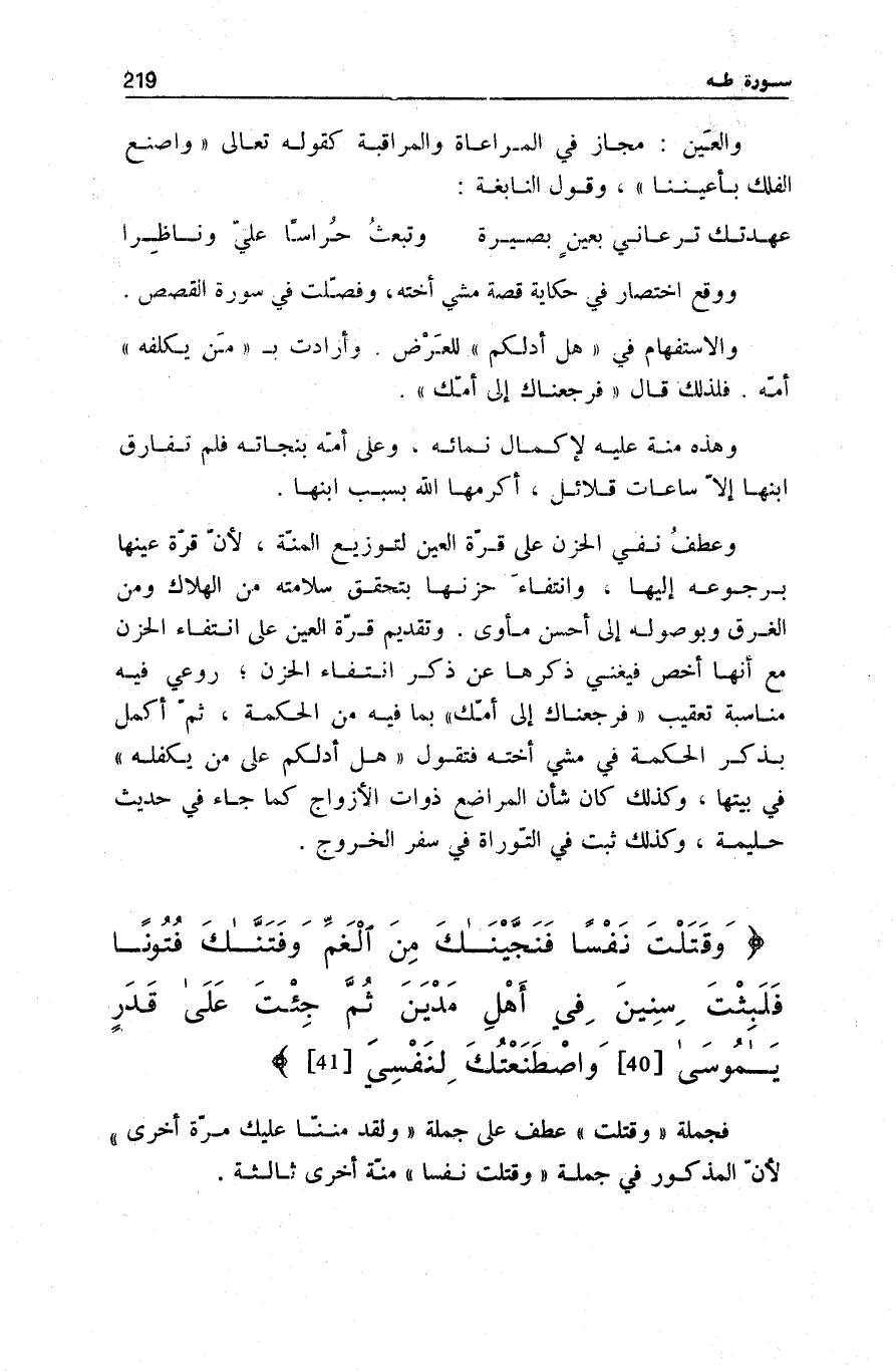 قُرَّةِ الْعَيْنِ عَلَى انْتِفَاءِ الْحُزْنِ مَعَ أَنَّهَا أَخَصُّ فَيُغْنِي ذِكْرُهَا عَنْ ذِكْرِ انْتِفَاءِ الْحُزْنِ رُوعِيَ فِيهِ مُنَاسَبَةُ تَعْقِيبِ فَرَجَعْناكَ إِلى أُمِّكَ بِمَا فِيهِ مِنَ الْحِكْمَةِ، ثُمَّ أُكْمِلَ بِذِكْرِ الْحِكْمَةِ فِي مَشْيِ أُخْتِهِ فَتَقُولُ: هَلْ أَدُلُّكُمْ عَلى مَنْ يَكْفُلُهُ فِي بَيْتِهَا، وَكَذَلِكَ كَانَ شَأْنُ الْمَرَاضِعِ ذَوَاتِ الْأَزْوَاجِ كَمَا جَاءَ فِي حَدِيثِ حَلِيمَةَ، وَكَذَلِكَ ثَبَتَ فِي التَّوْرَاةِ فِي سِفْرِ الْخُرُوجِ.