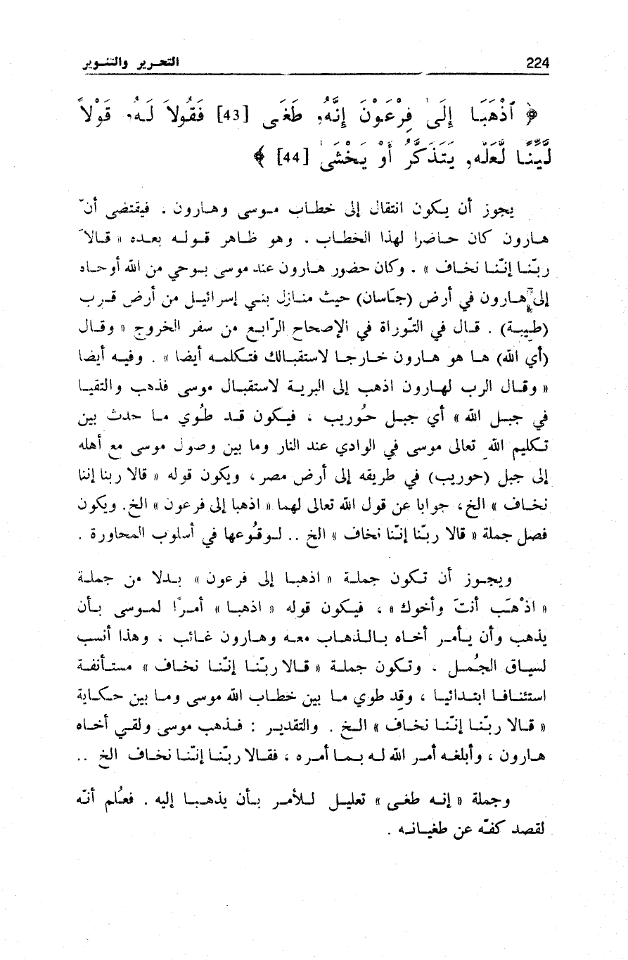 يَجُوزُ أَنْ يَكُونَ انْتِقَالٌ إِلَى خِطَابِ مُوسَى وَهَارُونَ. فَيَقْتَضِي أَنَّ هَارُونَ كَانَ حَاضِرًا لِهَذَا الْخِطَابِ، وَهُوَ ظَاهِرُ قَوْلِهِ بَعْدَهُ قَالَا رَبَّنا إِنَّنا نَخافُ [طه: 45] ، وَكَانَ حُضُورُ هَارُونَ عِنْدَ مُوسَى بِوَحْيٍ مِنَ اللَّهِ أَوْحَاهُ إِلَى هَارُونَ فِي أَرْضِ «جَاسَانَ» حَيْثُ مَنَازِلِ بَنِي إِسْرَائِيلَ مِنْ أَرْضٍ قُرْبَ (طِيبَةَ) . قَالَ فِي التَّوْرَاةِ فِي الْإِصْحَاحِ الرَّابِعِ مِنْ سِفْرِ الْخُرُوجِ «وَقَالَ (أَي الله) هَا هُوَ هَارُونُ خَارِجًا لِاسْتِقْبَالِكَ فَتُكَلِّمُهُ أَيْضًا» . وَفِيهِ أَيْضًا «وَقَالَ الرَّبُّ لِهَارُونَ اذْهَبْ إِلَى الْبَرِّيَّةِ لِاسْتِقْبَالِ مُوسَى فَذَهَبَ وَالْتَقَيَا فِي جَبَلِ اللَّهِ» أَيْ جَبَلِ حُورِيبَ، فَيَكُونُ قَدْ طُوِيَ مَا حَدَثَ بَيْنَ تَكْلِيمِ اللَّهِ تَعَالَى مُوسَى فِي الْوَادِي عِنْدَ النَّارِ وَمَا بَيْنَ وُصُولِ مُوسَى مَعَ أَهْلِهِ إِلَى جَبَلِ (حُورِيبَ) فِي طَرِيقِهِ إِلَى أَرْضِ مِصْرَ، وَيَكُونُ قَوْلُهُ قَالَا رَبَّنا إِنَّنا نَخافُ إِلَخْ، جَوَابًا عَنْ قَوْلِ اللَّهِ تَعَالَى لَهما: اذْهَبْ إِلى فِرْعَوْنَ إِلَخْ. وَيَكُونُ فَصْلُ جُمْلَةِ قَالَا رَبَّنا إِنَّنا نَخافُ إِلَخْ لِوُقُوعِهَا فِي أُسْلُوبِ الْمُحَاوَرَةِ.