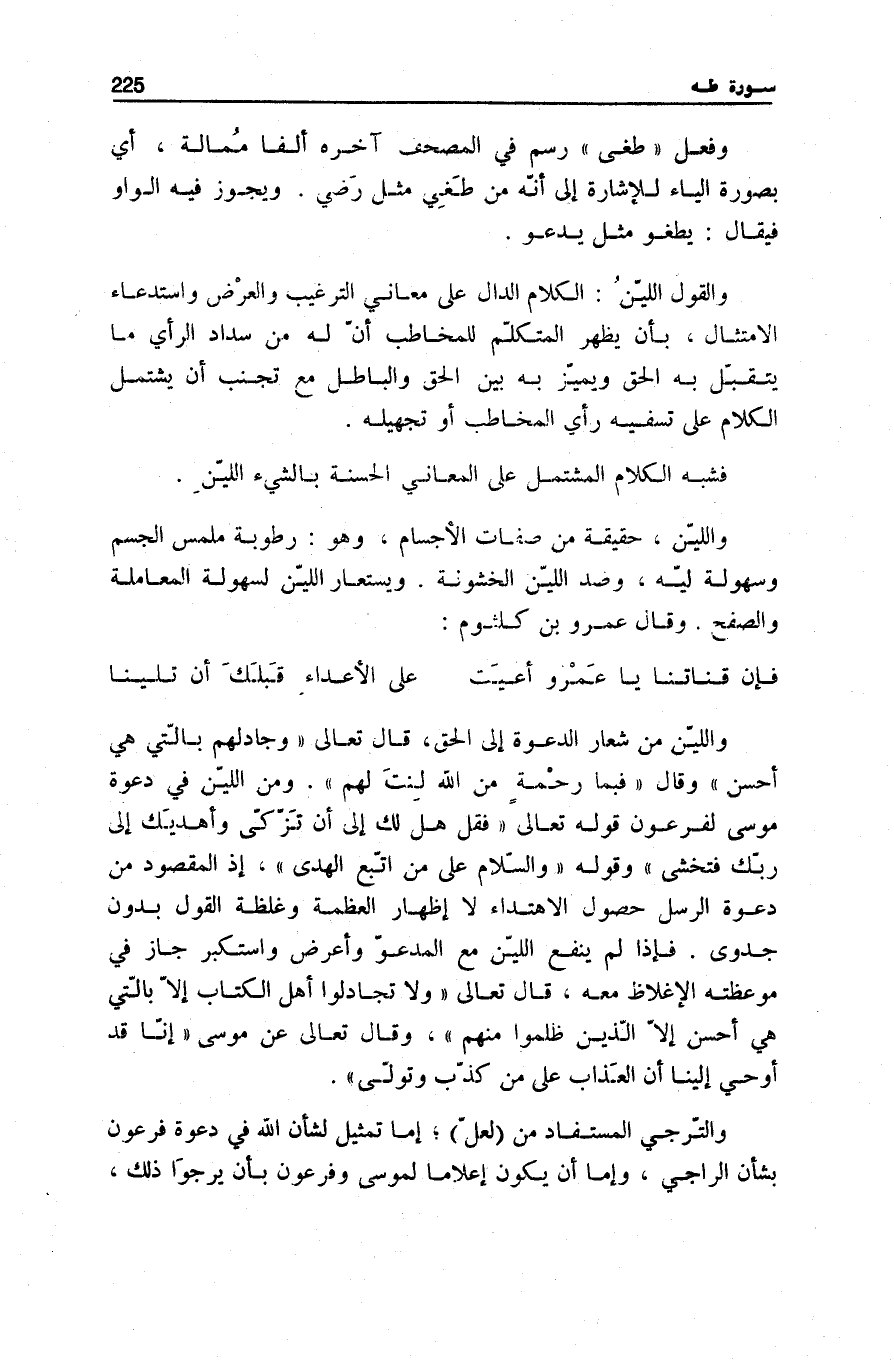 وَاللِّينُ مِنْ شِعَارِ الدَّعْوَةِ إِلَى الْحَقِّ، قَالَ تَعَالَى: وَجادِلْهُمْ بِالَّتِي هِيَ أَحْسَنُ [النَّحْل: 125] وَقَالَ: فَبِما رَحْمَةٍ مِنَ اللَّهِ لِنْتَ لَهُمْ [آل عمرَان: 159] . وَمِنَ اللِّينِ فِي دَعْوَةِ مُوسَى لِفِرْعَوْنَ قَوْلُهُ تَعَالَى: فَقُلْ هَلْ لَكَ إِلى أَنْ تَزَكَّى وَأَهْدِيَكَ إِلى رَبِّكَ فَتَخْشى [النازعات: 18، 19] وَقَوْلُهُ: وَالسَّلامُ عَلى مَنِ اتَّبَعَ الْهُدى [الْكَهْف: 47] ، إِذِ الْمَقْصُودُ مِنْ دَعْوَةِ الرُّسُلِ حُصُولُ الِاهْتِدَاءِ لَا إِظْهَارُ الْعَظَمَةِ وَغِلْظَةَ الْقَوْلِ بِدُونِ جَدْوًى. فَإِذَا لَمْ يَنْفَعِ اللِّينُ مَعَ الْمَدْعُوِّ وَأَعْرَضَ وَاسْتَكْبَرَ جَازَ فِي مَوْعِظَتِهِ الْإِغْلَاظُ مَعَهُ، قَالَ تَعَالَى: وَلا تُجادِلُوا أَهْلَ الْكِتابِ إِلَّا بِالَّتِي هِيَ أَحْسَنُ إِلَّا الَّذِينَ ظَلَمُوا مِنْهُمْ [العنكبوت: 46] ، وَقَالَ تَعَالَى عَنْ مُوسَى: إِنَّا قَدْ أُوحِيَ إِلَيْنا أَنَّ الْعَذابَ عَلى مَنْ كَذَّبَ وَتَوَلَّى [طه: 48] .