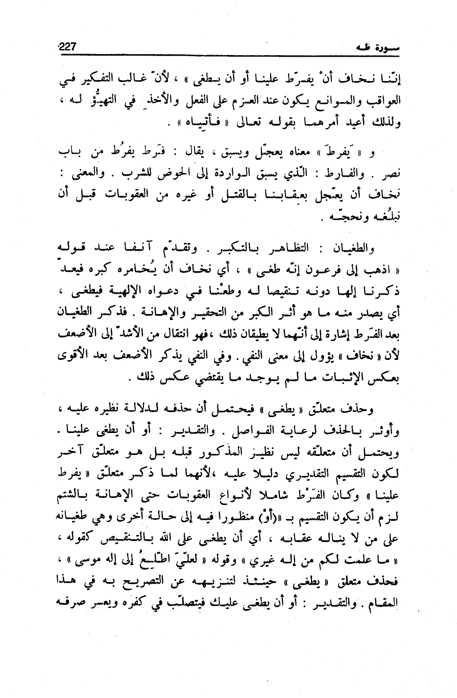 24] ، أَيْ نَخَافُ أَنْ يُخَامِرَهُ كِبْرُهُ فَيَعُدَّ ذِكْرَنَا إِلَهًا دُونَهُ تَنْقِيصًا لَهُ وَطَعْنًا فِي دَعْوَاهُ الْإِلَهِيَّةِ فَيَطْغَى، أَيْ يَصْدُرَ مِنْهُ مَا هُوَ أَثَرُ الْكِبَرِ مِنَ التَّحْقِيرِ وَالْإِهَانَةِ. فَذَكَرَ الطُّغْيَانَ بَعْدَ الْفَرْطِ إِشَارَةً إِلَى أَنَّهُمَا لَا يُطِيقَانِ ذَلِكَ، فَهُوَ انْتِقَالٌ مِنَ الْأَشَدِّ إِلَى الْأَضْعَفِ لِأَن نَخَاف يؤول إِلَى مَعْنَى النَّفِيِ. وَفِي النَّفْي يُذْكَرُ الْأَضْعَفُ بَعْدَ الْأَقْوَى بِعَكْسِ الْإِثْبَاتِ مَا لَمْ يُوجَدْ مَا يَقْتَضِي عَكْسَ ذَلِكَ.
