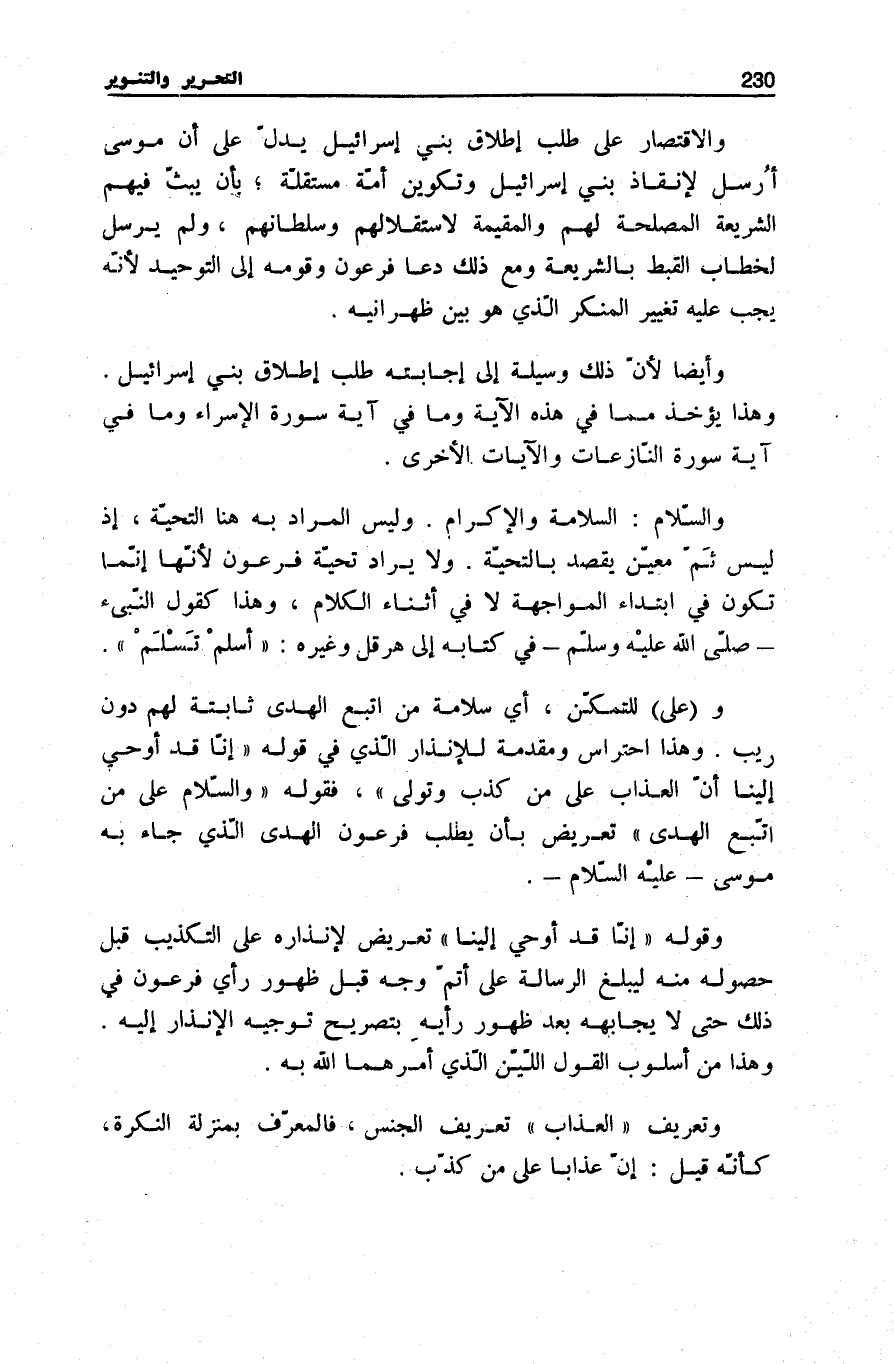 . وَ (عَلَى) لِلتَّمَكُّنِ، أَيْ سَلَامَةُ مَنِ اتَّبَعَ الْهُدَى ثَابِتَةٌ لَهُمْ دُونَ رَيْبٍ. وَهَذَا احْتِرَاسٌ وَمُقَدِّمَةٌ لِلْإِنْذَارِ الَّذِي فِي قَوْلِهِ إِنَّا قَدْ أُوحِيَ إِلَيْنا أَنَّ الْعَذابَ عَلى مَنْ كَذَّبَ وَتَوَلَّى، فَقَوْلُهُ: وَالسَّلامُ عَلى مَنِ اتَّبَعَ الْهُدى [طه: 47] تَعْرِيضٌ بِأَنْ يَطْلُبَ فِرْعَوْنُ الْهُدَى الَّذِي جَاءَ بِهِ مُوسَى- عَلَيْهِ السَّلَامُ-.