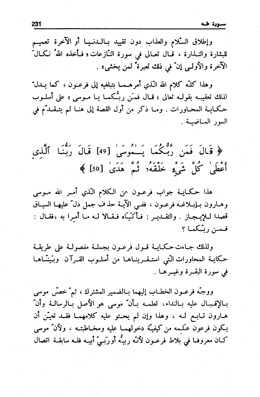 وَهَذَا كُلُّهُ كَلَامُ اللَّهِ الَّذِي أَمَرَهُمَا بِتَبْلِيغِهِ إِلَى فِرْعَوْنَ، كَمَا يَدُلُّ لِذَلِكَ تَعْقِيبُهُ بِقَوْلِهِ تَعَالَى: قالَ فَمَنْ رَبُّكُما يَا مُوسى [طه: 49] عَلَى أُسْلُوبِ حِكَايَةِ الْمُحَاوَرَاتِ. وَمَا ذُكِرَ مِنْ أَوَّلِ الْقِصَّةِ إِلَى هُنَا لَمْ يَتَقَدَّمْ فِي السُّور الْمَاضِيَة.
