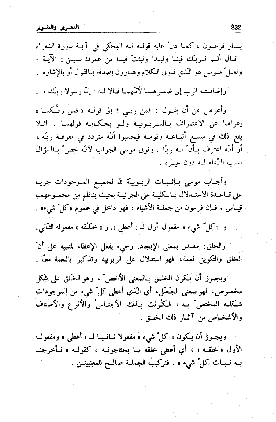 وَأَجَابَ مُوسَى بِإِثْبَاتِ الرُّبُوبِيَّةِ لِلَّهِ لِجَمِيعِ الْمَوْجُودَاتِ جَرْيًا عَلَى قَاعِدَةِ الِاسْتِدْلَالِ بِالْكُلِّيَّةِ عَلَى الْجُزْئِيَّةِ بِحَيْثُ يَنْتَظِمُ مِنْ مَجْمُوعِهِمَا قِيَاسٌ، فَإِنَّ فِرْعَوْنَ مِنْ جُمْلَةِ الْأَشْيَاءِ، فَهُوَ دَاخِلٌ فِي عُمُومِ كُلَّ شَيْءٍ.