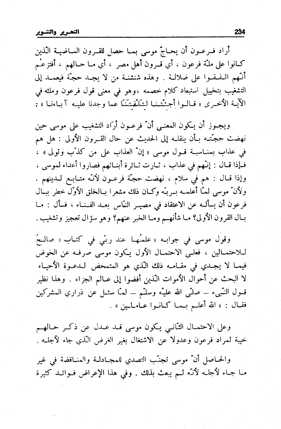 وَقَوْلُ مُوسَى فِي جَوَابِهِ عِلْمُها عِنْدَ رَبِّي فِي كِتابٍ صَالِحٌ لِلِاحْتِمَالَيْنِ، فَعَلَى الِاحْتِمَالِ الْأَوَّلِ يَكُونُ مُوسَى صَرَفَهُ عَنِ الْخَوْضِ فِيمَا لَا يُجْدِي فِي مَقَامِهِ ذَلِكَ الَّذِي هُوَ الْمُتَمَحِّضُ لِدَعْوَةِ الْأَحْيَاءِ لَا الْبَحْث عَن أَحْوَال الْأَمْوَاتِ الَّذِينَ أَفْضَوْا إِلَى عَالَمِ الْجَزَاءِ، وَهَذَا نَظِيرُ
