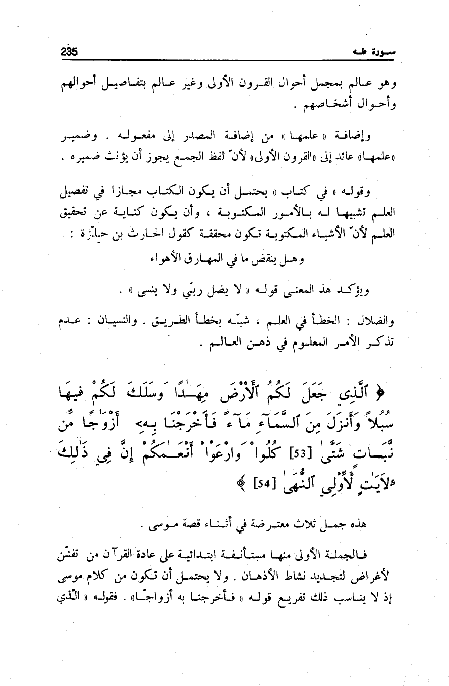فَالْجُمْلَةُ الْأُولَى مِنْهَا مُسْتَأْنَفَةٌ ابْتِدَائِيَّةٌ عَلَى عَادَةِ الْقُرْآنِ من تفنّن الْأَغْرَاض لِتَجْدِيدِ نَشَاطِ الْأَذْهَانِ. وَلَا يُحْتَمَلُ أَنْ تَكُونَ مِنْ كَلَامِ مُوسَى إِذْ لَا يُنَاسِبُ ذَلِكَ تَفْرِيعَ قَوْلِهِ: فَأَخْرَجْنا بِهِ أَزْواجاً. فَقَوْلُهُ
