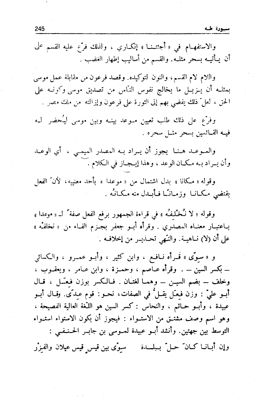 وسُوىً قَرَأَهُ نَافِعٌ، وَابْنُ كَثِيرٍ، وَأَبُو عَمْرٍو، وَالْكِسَائِيِّ- بِكَسْرِ السِّينِ-. وَقَرَأَهُ عَاصِمٌ، وَحَمْزَةُ، وَابْنُ عَامِرٍ، وَيَعْقُوبُ، وَخَلَفٌ- بِضَمِّ السِّينِ- وَهُمَا لُغَتَانِ، فَالْكَسْرُ بِوَزْنِ فِعَلْ، قَالَ أَبُو عَلِيٍّ: وَزْنُ فِعَلْ يَقِلُّ فِي الصِّفَاتِ، نَحْوَ: قَوْمٌ عِدًى. وَقَالَ أَبُو عُبَيْدَةَ، وَأَبُو حَاتِمٍ، وَالنَّحَّاسُ: كَسْرُ السِّينِ هُوَ اللُّغَةُ الْعَالِيَةُ الْفَصِيحَةُ، وَهُوَ اسْمُ وَصْفٍ مُشْتَقٌّ مِنَ الِاسْتِوَاءِ: فَيَجُوزُ أَنْ يَكُونَ الِاسْتِوَاءُ اسْتِوَاءَ التَّوَسُّطِ بَيْنَ جِهَتَيْنِ. وَأَنْشَدَ أَبُو عُبَيْدَةَ لِمُوسَى ابْن جَابِرٍ الْحَنَفِيِّ: