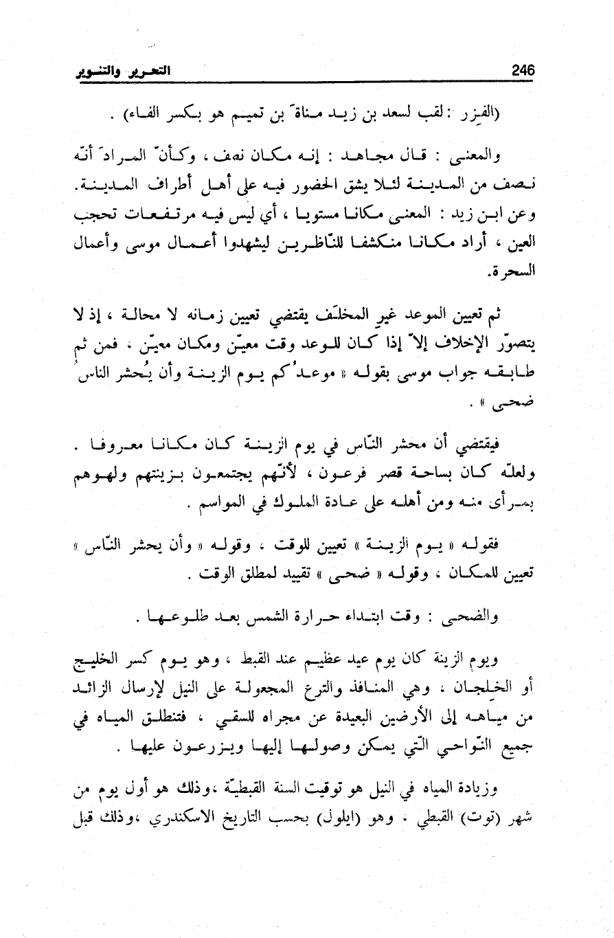 ثُمَّ تَعْيِينُ الْمَوْعِدِ غَيْرُ المخلف يَقْتَضِي تعْيين زَمَانَهُ لَا مَحَالَةَ، إِذْ لَا يُتَصَوَّرُ الْإِخْلَافُ إِلَّا إِذَا كَانَ لِلْوَعْدِ وَقْتٌ مُعَيَّنٌ وَمَكَانٌ مُعَيَّنٌ، فَمِنْ ثَمَّ طَابَقَهُ جَوَابُ مُوسَى بقوله قالَ مَوْعِدُكُمْ يَوْمُ الزِّينَةِ وَأَنْ يُحْشَرَ النَّاسُ ضُحًى.