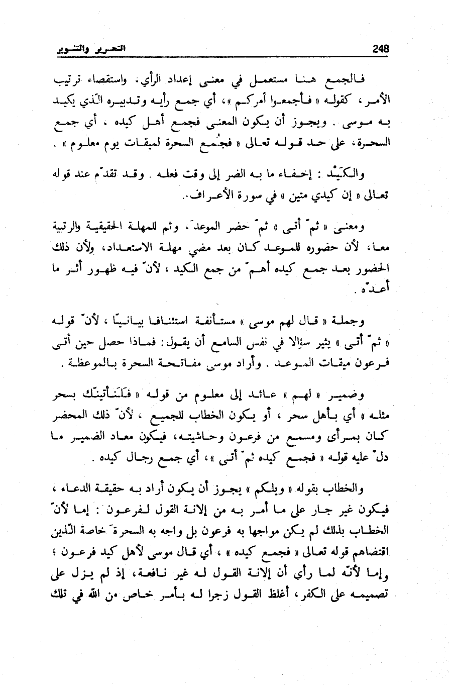 وَمَعْنَى ثُمَّ أَتى ثُمَّ حَضَرَ الْمَوْعِدَ، وَثمّ لِلْمُهْلَةِ الْحَقِيقِيَّةِ والْرُتْبِيَّةِ مَعًا، لِأَنَّ حُضُورَهُ لِلْمَوْعِدِ كَانَ بَعْدَ مُضِيِّ مُهْلَةِ الِاسْتِعْدَادِ، وَلِأَنَّ ذَلِكَ الْحُضُورَ بَعْدَ جَمْعِ كَيْدِهِ أَهَمُّ مِنْ جَمْعِ الْكَيْدِ، لِأَنَّ فِيهِ ظُهُورَ أَثَرِ مَا أَعَدَّهُ.