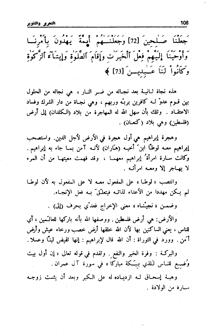 هَذِهِ نَجَاةٌ ثَانِيَةٌ بَعْدَ نَجَاتِهِ مِنْ ضُرِّ النَّارِ، هِيَ نَجَاتُهُ مِنَ الْحُلُولِ بَيْنَ قَوْمٍ عَدُوٍّ لَهُ كَافِرِينَ بِرَبِّهِ وَرَبِّهِمْ، وَهِيَ نَجَاةٌ مِنْ دَارِ الشِّرْكِ وَفَسَادِ الِاعْتِقَادِ. وَتِلْكَ بِأَنْ سَهَّلَ اللَّهُ لَهُ الْمُهَاجَرَةَ مِنْ بِلَادِ (الْكَلْدَانِ) إِلَى أَرْضِ (فِلَسْطِينَ) وَهِيَ بِلَادُ (كَنْعَانَ) .