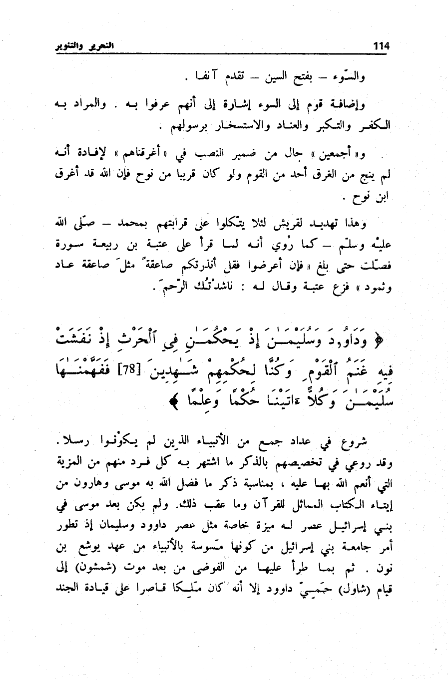 وَدَاوُد وسليمن إِذْ يَحْكُمَانِ فِي الْحَرْثِ إِذْ نَفَشَتْ فِيهِ غَنَمُ الْقَوْمِ وكنّا لحكمهم شهدين (78) ففهّمنا سليمن وكلّا ءاتينا حُكْمًا وَعِلْمًا شُرُوعٌ فِي عِدَادِ جَمْعٍ مِنَ الْأَنْبِيَاءِ الَّذِينَ لَمْ يَكُونُوا رُسُلًا. وَقَدْ رُوعِيَ فِي تَخْصِيصِهِمْ بِالذِّكْرِ مَا اشْتُهِرَ بِهِ كُلُّ فَرْدٍ مِنْهُمْ مَنِ الْمَزِيَّةِ الَّتِي أَنْعَمَ اللَّهُ بِهَا عَلَيْهِ، بِمُنَاسَبَةِ ذِكْرِ مَا فَضَّلَ اللَّهُ بِهِ مُوسَى وَهَارُونَ مِنْ إيتَاء الْكتاب المماثل لِلْقُرْآنِ وَمَا عَقِبَ ذَلِكَ. وَلَمْ يَكُنْ بَعْدَ مُوسَى فِي بَنِي إِسْرَائِيلَ عَصْرٌ لَهُ مَيْزَةٌ خَاصَّةٌ مثل عصر دَاوُود وَسُلَيْمَانَ إِذْ تَطَوَّرَ أَمْرُ جَامِعَةِ بَنِي إِسْرَائِيلَ مِنْ كَوْنِهَا مَسُوسَةً بِالْأَنْبِيَاءِ مِنْ عَهْدِ يُوشَعَ بْنِ نُونَ. ثُمَّ بِمَا طَرَأَ عَلَيْهَا مِنَ الْفَوْضَى مِنْ بَعْدِ مَوْتِ (شَمْشُونَ) إِلَى قِيَامِ (شاول) حميّ دَاوُود إِلَّا أَنَّهُ كَانَ مَلِكًا قَاصِرًا على قيادة الْجنَّة