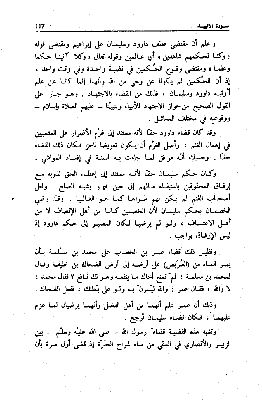 وَاعْلَمْ أَنَّ مُقْتَضى عطف دَاوُود وَسُلَيْمَانَ عَلَى إِبْرَاهِيمَ وَمُقْتَضَى قَوْلِهِ وَكُنَّا لِحُكْمِهِمْ شاهِدِينَ أَيْ عَالِمِينَ وَقَوْلِهِ تَعَالَى: وَكُلًّا آتَيْنا حُكْماً وَعِلْماً وَمُقْتَضَى وُقُوعِ الْحُكْمَيْنِ فِي قَضِيَّةٍ وَاحِدَةٍ وَفِي وَقْتٍ وَاحِدٍ، إِذْ إِنَّ الْحُكْمَيْنِ لَمْ يَكُونَا عَنْ وَحْيٍ مِنَ اللَّهِ وَأَنَّهُمَا إِنَّمَا كَانَا عَنْ علم أوتيه دَاوُود وَسُلَيْمَانُ، فَذَلِكَ مِنَ الْقَضَاءِ بِالِاجْتِهَادِ. وَهُوَ جَارٍ عَلَى الْقَوْلِ الصَّحِيحِ مِنْ جَوَازِ الِاجْتِهَاد للأنبياء ولنبينا عَلَيْهِم الصَّلَاة وَالسَّلَام وَوُقُوعِهِ فِي مُخْتَلِفِ الْمَسَائِلِ.