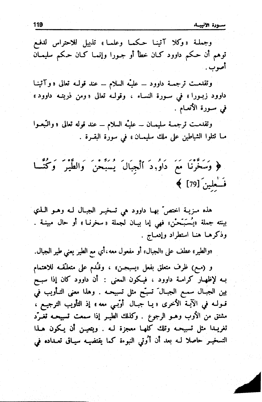 وَسَخَّرْنا مَعَ داوُدَ الْجِبالَ يُسَبِّحْنَ وَالطَّيْرَ وَكُنَّا فاعِلِينَ هَذِهِ مَزِيَّةٌ اختصّ بهَا دَاوُود وَهِي تَسْخِيرُ الْجِبَالِ لَهُ وَهُوَ الَّذِي بَيَّنَتْهُ جُمْلَةُ يُسَبِّحْنَ فَهِيَ إِمَّا بَيَانٌ لِجُمْلَةِ سَخَّرْنا أَوْ حَالٌ مُبَيِّنَةٌ. وَذِكْرُهَا هُنَا اسْتِطْرَادٌ وَإِدْمَاجٌ.