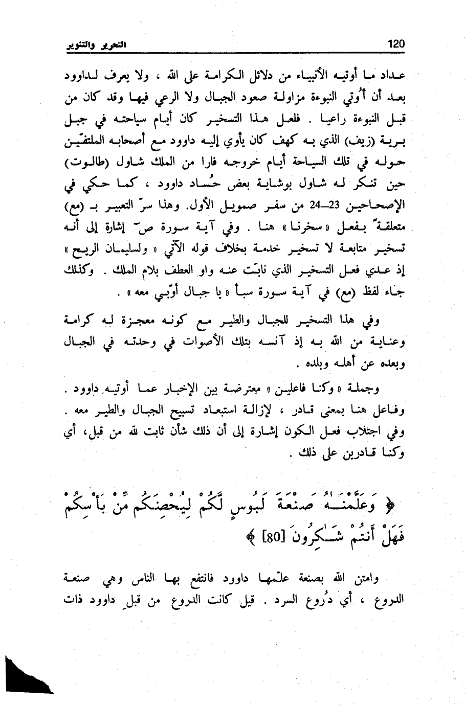 قَبْلِ النُّبُوءَةِ رَاعِيًا. فَلَعَلَّ هَذَا التَّسْخِيرَ كَانَ أَيَّامَ سِيَاحَتِهِ فِي جَبَلِ بَرِّيَّةِ (زَيْفٍ) الَّذِي بِهِ كَهْفٌ كَانَ يأوي إِلَيْهِ دَاوُود مَعَ أَصْحَابِهِ الْمُلْتَفِّينَ حَوْلَهُ فِي تِلْكَ السِّيَاحَةِ أَيَّامَ خُرُوجِهِ فَارًّا مِنَ الْمَلِكِ شَاوَلَ (طَالُوتَ) حِينَ تَنَكَّرَ لَهُ شَاوَلُ بِوِشَايَةِ بعض حساد دَاوُود، كَمَا حُكِيَ فِي الْإِصْحَاحَيْنِ 23- 24 مِنْ سِفْرِ صَمْوِيلَ الْأَوَّلِ. وَهَذَا سِرُّ التَّعْبِيرِ بِ (مَعَ) مُتَعَلِّقَةً بِفِعْلِ سَخَّرْنا هُنَا. وَفِي آيَةِ سُورَةِ ص إِشَارَةٌ إِلَى أَنَّهُ تَسْخِيرُ مُتَابَعَةٍ لَا تَسْخِيرُ خِدْمَةٍ بِخِلَافِ قَوْلِهِ الْآتِي وَلِسُلَيْمانَ الرِّيحَ [الْأَنْبِيَاء: 81] إِذْ عُدِّيَ فِعْلُ التَّسْخِيرِ الَّذِي نَابَتْ عَنْهُ وَاوُ الْعَطْفِ بِلَامِ الْمِلْكِ. وَكَذَلِكَ جَاءَ لَفْظُ (مَعَ) فِي آيَةِ [سُورَةِ سَبَأٍ: 10] يَا جِبالُ أَوِّبِي مَعَهُ.