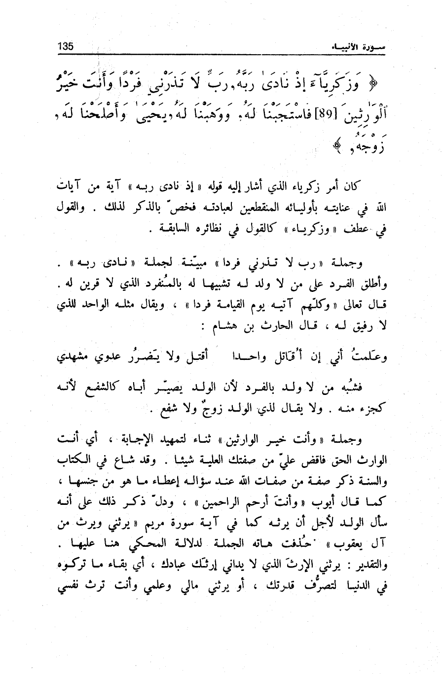 وَجُمْلَةُ رَبِّ لَا تَذَرْنِي فَرْداً مُبَيِّنَةٌ لِجُمْلَةِ نَادَى رَبَّهُ. وَأُطْلِقَ الْفَرْدُ عَلَى مَنْ لَا وَلَدَ لَهُ تَشْبِيهًا لَهُ بِالْمُنْفَرِدِ الَّذِي لَا قَرِينَ لَهُ. قَالَ تَعَالَى: وَكُلُّهُمْ آتِيهِ يَوْمَ الْقِيامَةِ فَرْداً [مَرْيَم: 95] ، وَيُقَالُ مِثْلَهُ الْوَاحِدُ لِلَّذِي لَا رَفِيقَ لَهُ، قَالَ الْحَارِثُ بْنُ هِشَامٍ:
