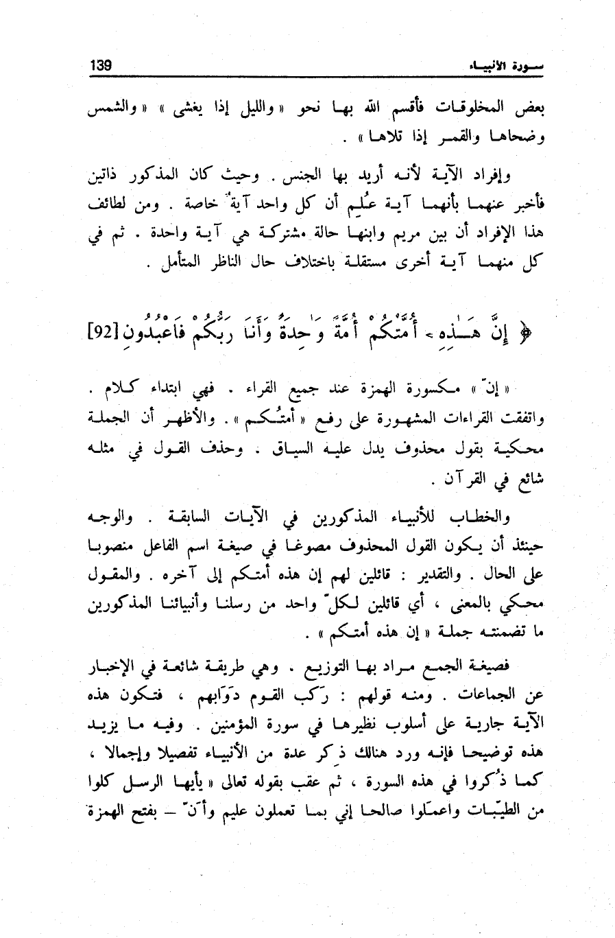 وَالْخِطَابُ لِلْأَنْبِيَاءِ الْمَذْكُورِينَ فِي الْآيَاتِ السَّابِقَةِ. وَالْوَجْهُ حِينَئِذٍ أَنْ يَكُونَ الْقَوْلُ الْمَحْذُوفُ مَصُوغًا فِي صِيغَةِ اسْمِ الْفَاعِلِ مَنْصُوبًا عَلَى الْحَالِ. وَالتَّقْدِيرُ: قَائِلِينَ لَهُمْ إِنَّ هَذِهِ أُمَّتُكُمْ إِلَى آخِرِهِ. وَالْمَقُولُ مَحْكِيٌّ بِالْمَعْنَى، أَيْ قَائِلِينَ لِكُلِّ وَاحِدٍ مِنْ رُسُلِنَا وَأَنْبِيَائِنَا الْمَذْكُورِينَ مَا تَضَمَّنَتْهُ جُمْلَةُ إِنَّ هذِهِ أُمَّتُكُمْ.