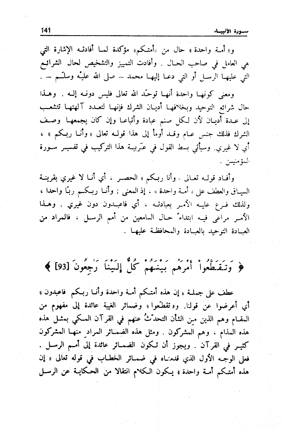 وَ (أُمَّةً واحِدَةً) حَالٌ مِنْ أُمَّتُكُمْ مُؤَكِّدَةٌ لِمَا أَفَادَتْهُ الْإِشَارَةُ الَّتِي هِيَ الْعَامِلُ فِي صَاحِبِ الْحَالِ. وَأَفَادَتِ التَّمْيِيزَ وَالتَّشْخِيصَ لِحَالِ الشَّرَائِعِ الَّتِي عَلَيْهَا الرُّسُلُ أَوِ الَّتِي دَعَا إِلَيْهَا مُحَمَّدٌ صَلَّى اللهُ عَلَيْهِ وَسَلَّمَ.