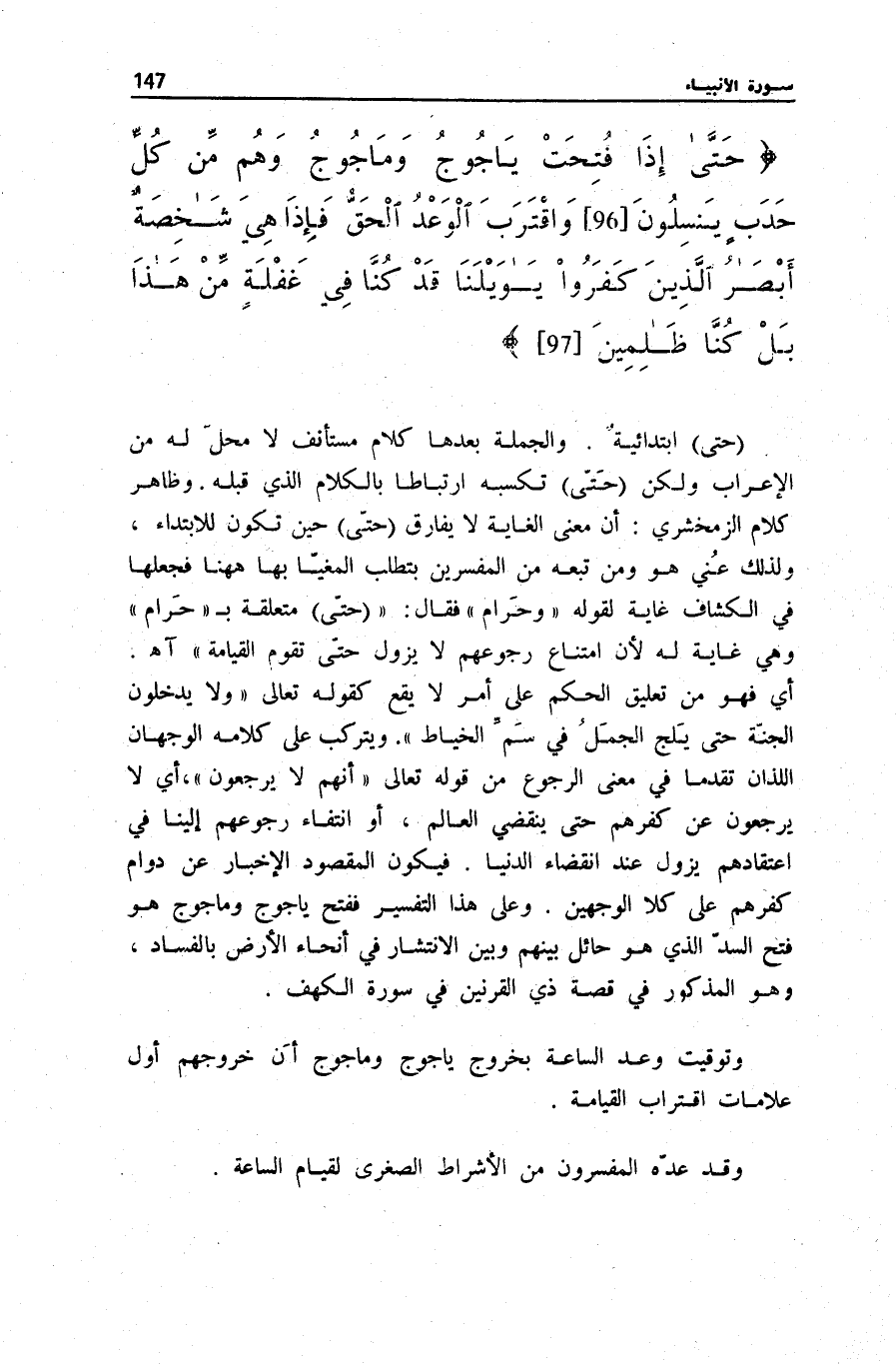 [الْأَنْبِيَاء: 95] ، أَيْ لَا يَرْجِعُونَ عَنْ كُفْرِهِمْ حَتَّى يَنْقَضِيَ الْعَالَمُ، أَوِ انْتِفَاءُ رُجُوعِهِمْ إِلَيْنَا فِي اعْتِقَادِهِمْ يَزُولُ عِنْدَ انْقِضَاءِ الدُّنْيَا. فَيَكُونُ الْمَقْصُودُ الْإِخْبَارَ عَنْ دَوَامِ كُفْرِهِمْ عَلَى كِلَا الْوَجْهَيْنِ. وَعَلَى هَذَا التَّفْسِيرِ فَفَتْحُ يَاجُوجَ وَمَاجُوجَ هُوَ فَتْحُ السَّدِّ الَّذِي هُوَ حَائِلٌ بَيْنَهُمْ وَبَيْنَ الِانْتِشَارِ فِي أَنْحَاءِ الْأَرْضِ بِالْفَسَادِ، وَهُوَ الْمَذْكُورُ فِي قِصَّةِ ذِي الْقَرْنَيْنِ فِي سُورَةِ الْكَهْفِ.
