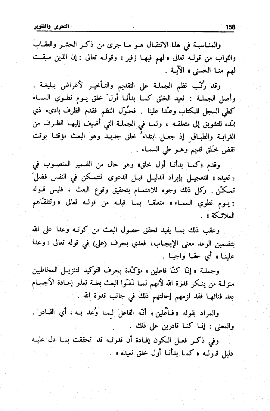 الْخَلْقَ كَمَا بَدَأْنَا أَوَّلَ خَلْقٍ يَوْمَ نَطْوِي السَّمَاءَ كَطَيِّ السِّجِلِّ لِلْكِتَابِ وَعْدًا عَلَيْنَا. فَحُوِّلَ النَّظْمُ فَقدم الظّرْف بادىء ذِي بَدْءٍ لِلتَّشْوِيقِ إِلَى مُتَعَلِّقِهِ، وَلِمَا فِي الْجُمْلَةِ الَّتِي أُضِيفَ إِلَيْهَا الظَّرْفُ مِنَ الْغَرَابَةِ وَالطِّبَاقِ إِذْ جُعِلَ ابْتِدَاءُ خَلْقٍ جَدِيدٍ وَهُوَ الْبَعْثُ مُؤَقَّتًا بِوَقْتِ نَقْضِ خَلْقٍ قَدِيمٍ وَهُوَ طَيُّ السَّمَاءِ.