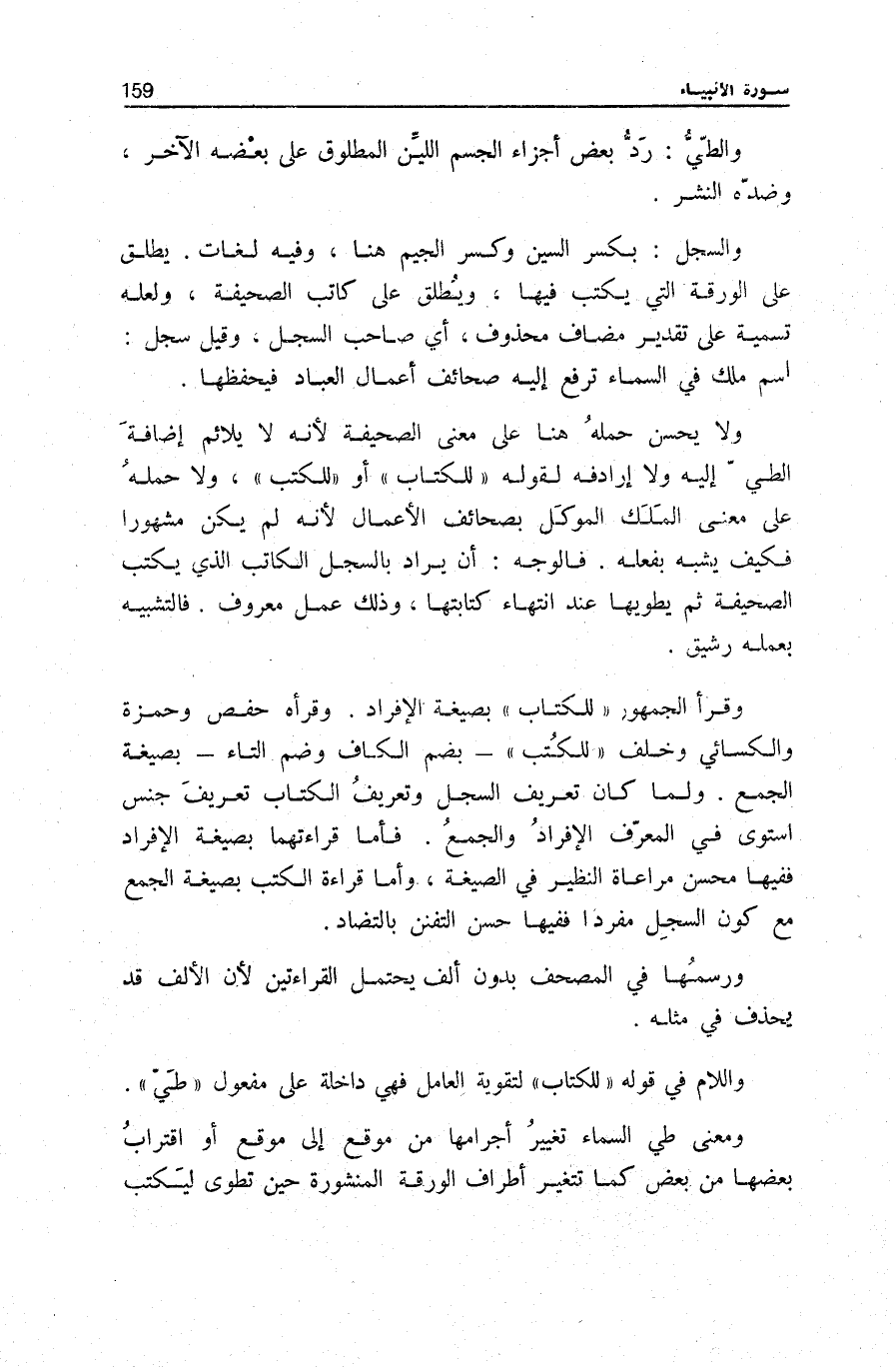 وَلَا يَحْسُنُ حَمْلُهُ هُنَا عَلَى مَعْنَى الصَّحِيفَةِ لِأَنَّهُ لَا يُلَائِمُ إِضَافَةَ الطَّيِّ إِلَيْهِ وَلَا إردافه لِقَوْلِهِ لِلْكِتَابِ أَوْ لِلْكُتُبِ، وَلَا حَمْلُهُ عَلَى مَعْنَى الْمَلَكِ الْمُوَكَّلِ بِصَحَائِفِ الْأَعْمَالِ لِأَنَّهُ لَمْ يَكُنْ مَشْهُورًا فَكَيْفَ يُشَبَّهُ بِفِعْلِهِ. فَالْوَجْهُ: أَنْ يُرَادَ بِالسِّجِلِّ الْكَاتِبُ الَّذِي يَكْتُبُ الصَّحِيفَةَ ثُمَّ يَطْوِيهَا عِنْدَ انْتِهَاءِ كِتَابَتِهَا، وَذَلِكَ عَمَلٌ مَعْرُوفٌ. فَالتَّشْبِيهُ بِعَمَلِهِ رَشِيقٌ.