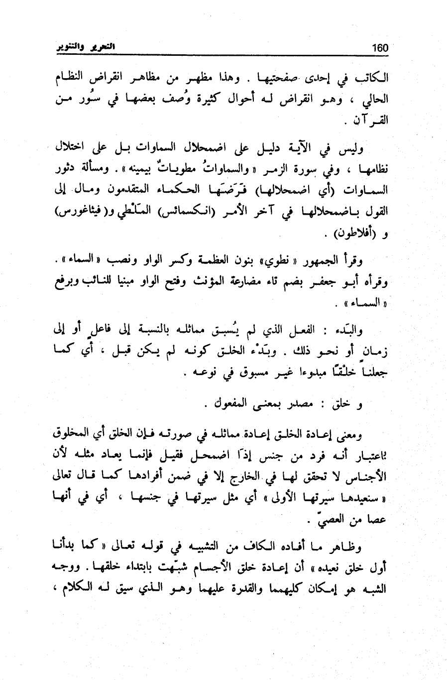 وَلَيْسَ فِي الْآيَةِ دَلِيلٌ عَلَى اضْمِحْلَالِ السَّمَاوَاتِ بَلْ عَلَى اخْتِلَالِ نِظَامِهَا، وَفِي [سُورَةِ الزُّمَرِ: 67] وَالسَّماواتُ مَطْوِيَّاتٌ بِيَمِينِهِ. وَمَسْأَلَةُ دُثُورِ السَّمَاوَاتِ (أَيِ اضْمِحْلَالُهَا) فَرَضَهَا الْحُكَمَاءُ الْمُتَقَدِّمُونَ وَمَالَ إِلَى الْقَوْلِ بِاضْمِحْلَالِهَا فِي آخِرِ الْأَمْرِ (انكسمائس) الْمَلْطِي و (فيثاغورس) و (أفلاطون) .