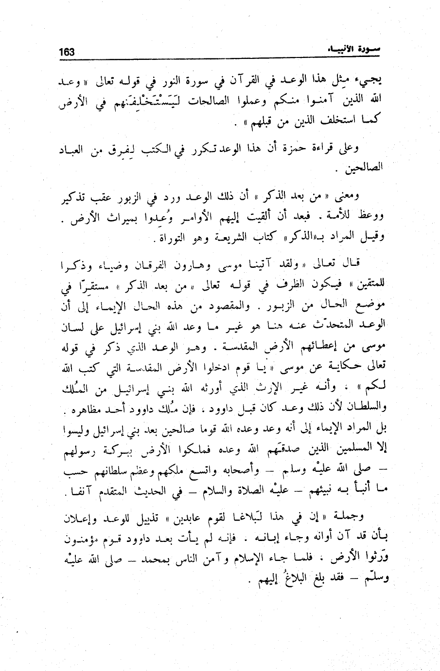21] ، وَأَنَّهُ غَيْرُ الْإِرْثِ الَّذِي أَوْرَثَهُ اللَّهُ بَنِي إِسْرَائِيلَ مِنَ الْمُلْكِ وَالسُّلْطَانِ لِأَنَّ ذَلِكَ وَعْدٌ كَانَ قبل دَاوُود. فَإِن ملك دَاوُود أَحَدُ مَظَاهِرِهِ. بَلِ الْمُرَادُ الْإِيمَاءُ إِلَى أَنَّهُ وَعْدٌ وَعَدَهُ اللَّهُ قَوْمًا صَالِحِينَ بَعْدَ بَنِي إِسْرَائِيلَ وَلَيْسُوا إِلَّا الْمُسْلِمِينَ الَّذِينَ صَدَقَهُمُ اللَّهُ وَعْدَهُ فَمَلَكُوا الْأَرْضَ