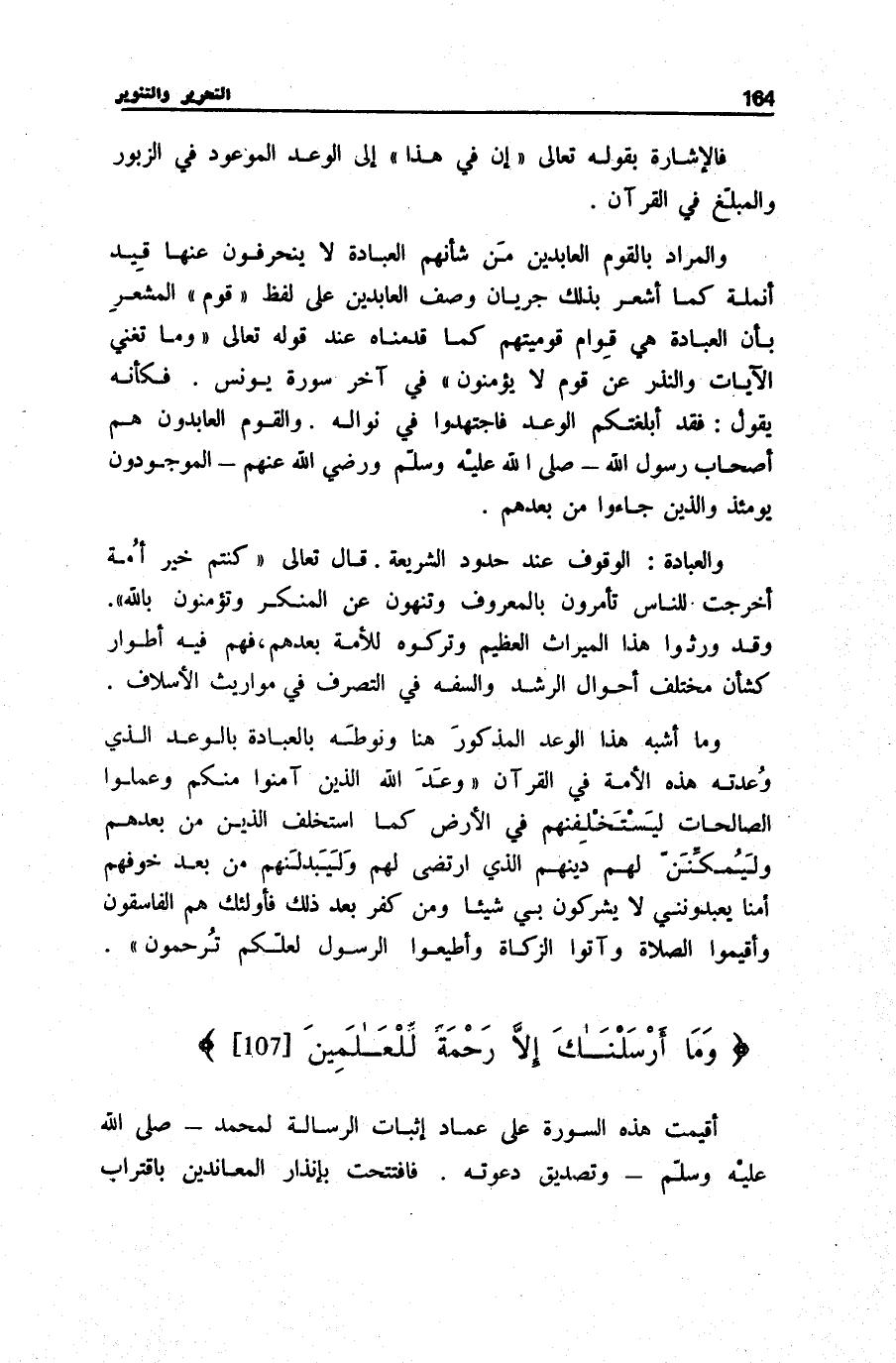 وَالْعِبَادَةُ: الْوُقُوفُ عِنْدَ حُدُودِ الشَّرِيعَةِ. قَالَ تَعَالَى: كُنْتُمْ خَيْرَ أُمَّةٍ أُخْرِجَتْ لِلنَّاسِ تَأْمُرُونَ بِالْمَعْرُوفِ وَتَنْهَوْنَ عَنِ الْمُنْكَرِ وَتُؤْمِنُونَ بِاللَّهِ [آل عمرَان: 110] . وَقَدْ وَرِثُوا هَذَا الْمِيرَاثَ الْعَظِيمَ وَتَرَكُوهُ لِلْأُمَّةِ بَعْدَهُمْ، فَهُمْ فِيهِ أَطْوَارٌ كَشَأْنِ مُخْتَلِفِ أَحْوَالِ الرُّشْدِ وَالسَّفَهِ فِي التَّصَرُّفِ فِي مَوَارِيثِ الْأَسْلَافِ.