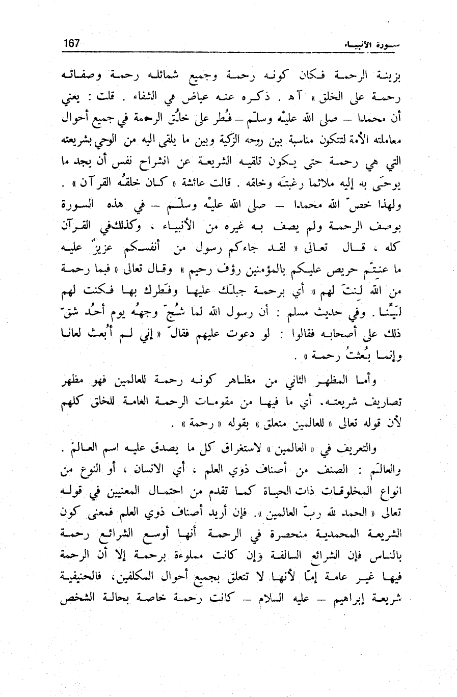 الصِّنْفُ مِنْ أَصْنَافِ ذَوِي الْعِلْمِ، أَيِ الْإِنْسَانُ، أَوِ النَّوْعُ مِنْ أَنْوَاعِ الْمَخْلُوقَاتِ ذَاتِ الْحَيَاةِ كَمَا تَقَدَّمَ مِنِ احْتِمَالِ الْمَعْنَيَيْنِ فِي قَوْلِهِ تَعَالَى: الْحَمْدُ لِلَّهِ رَبِّ الْعالَمِينَ [الْفَاتِحَة: 2] . فَإِنْ أُرِيدَ أَصْنَافُ ذَوِي الْعِلْمِ فَمَعْنَى كَوْنِ الشَّرِيعَةِ الْمُحَمَّدِيَّةِ مُنْحَصِرَةً فِي الرَّحْمَةِ أَنَّهَا أَوْسَعُ الشَّرَائِعِ رَحْمَةً بِالنَّاسِ فَإِنَّ الشَّرَائِعَ السَّالِفَةَ وَإِنْ كَانَتْ مَمْلُوءَةً بِرَحْمَةٍ إِلَّا أَنَّ الرَّحْمَةَ فِيهَا غَيْرُ عَامَّةٍ إِمَّا لِأَنَّهَا لَا تَتَعَلَّقُ بِجَمِيعِ أَحْوَالِ الْمُكَلَّفِينَ، فَالْحَنِيفِيَّةُ شَرِيعَةُ إِبْرَاهِيمَ عَلَيْهِ السَّلَامُ كَانَتْ رَحْمَةً خَاصَّةً بِحَالَةِ الشَّخْصِ