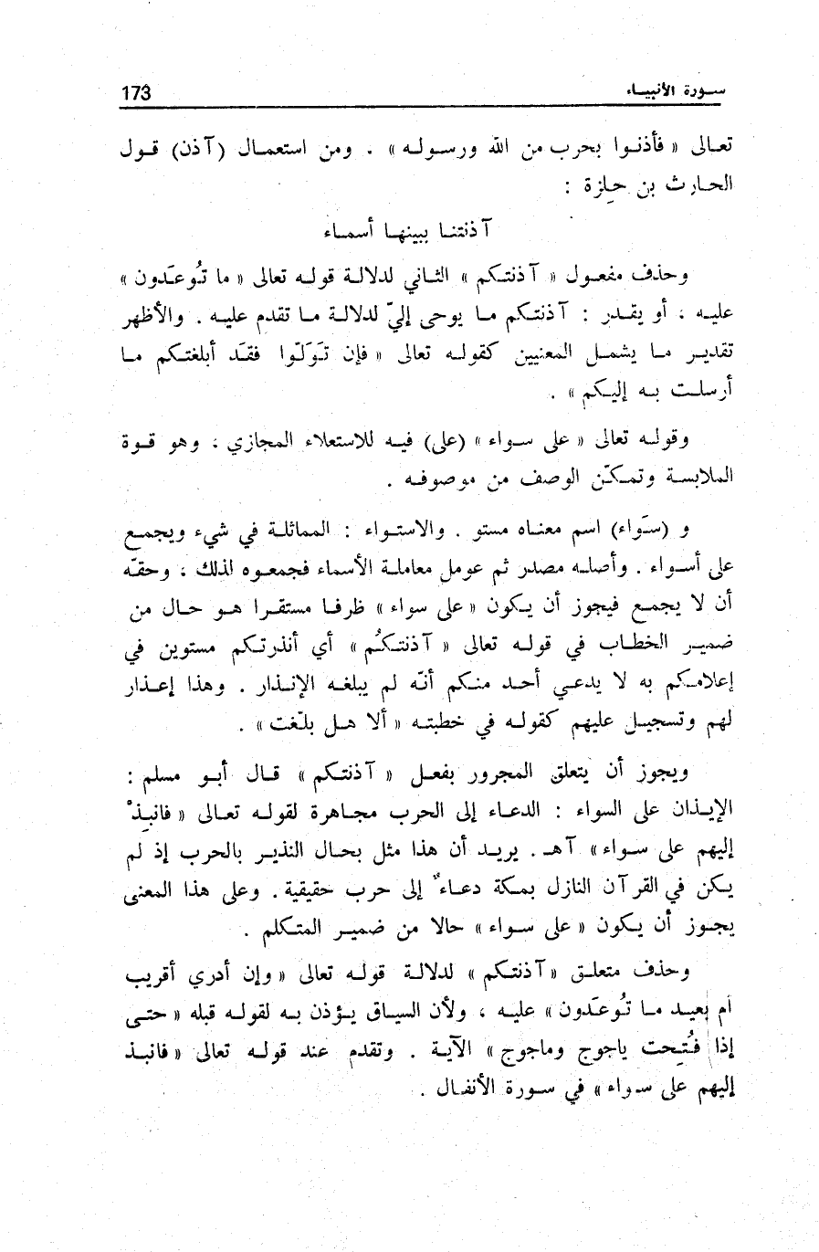 وَأَصْلُهُ مَصْدَرٌ ثُمَّ عُومِلَ مُعَامَلَةَ الْأَسْمَاءِ فَجَمَعُوهُ لِذَلِكَ، وَحَقُّهُ أَنْ لَا يُجْمَعَ فَيَجُوزُ أَنْ يَكُونَ عَلى سَواءٍ ظَرْفًا مُسْتَقِرًّا هُوَ حَالٌ مِنْ ضَمِيرِ الْخِطَابِ فِي قَوْلِهِ تَعَالَى آذَنْتُكُمْ أَيْ أَنْذَرْتُكُمْ مُسْتَوِينَ فِي إِعْلَامِكُمْ بِهِ لَا يَدَّعِي أَحَدٌ مِنْكُمْ أَنَّهُ لَمْ يَبْلُغْهُ الْإِنْذَارُ. وَهَذَا إِعْذَارٌ لَهُمْ وَتَسْجِيلٌ عَلَيْهِمْ