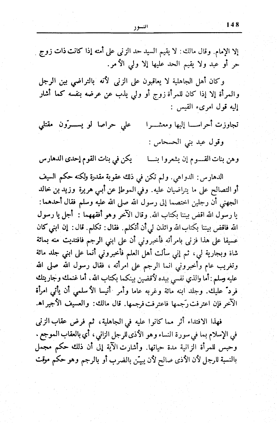 وَكَانَ أَهْلُ الْجَاهِلِيَّةِ لَا يُعَاقِبُونَ عَلَى الزِّنَى لِأَنَّهُ بِالتَّرَاضِي بَيْنَ الرَّجُلِ وَالْمَرْأَةِ إِلَّا إِذَا كَانَ لِلْمَرْأَةِ زَوْجٌ أَوْ وَلِيٌّ يَذُبُّ عَنْ عِرْضِهِ بِنَفْسِهِ كَمَا أَشَارَ إِلَيْهِ قَوْلُ امْرِئِ الْقَيْسِ: