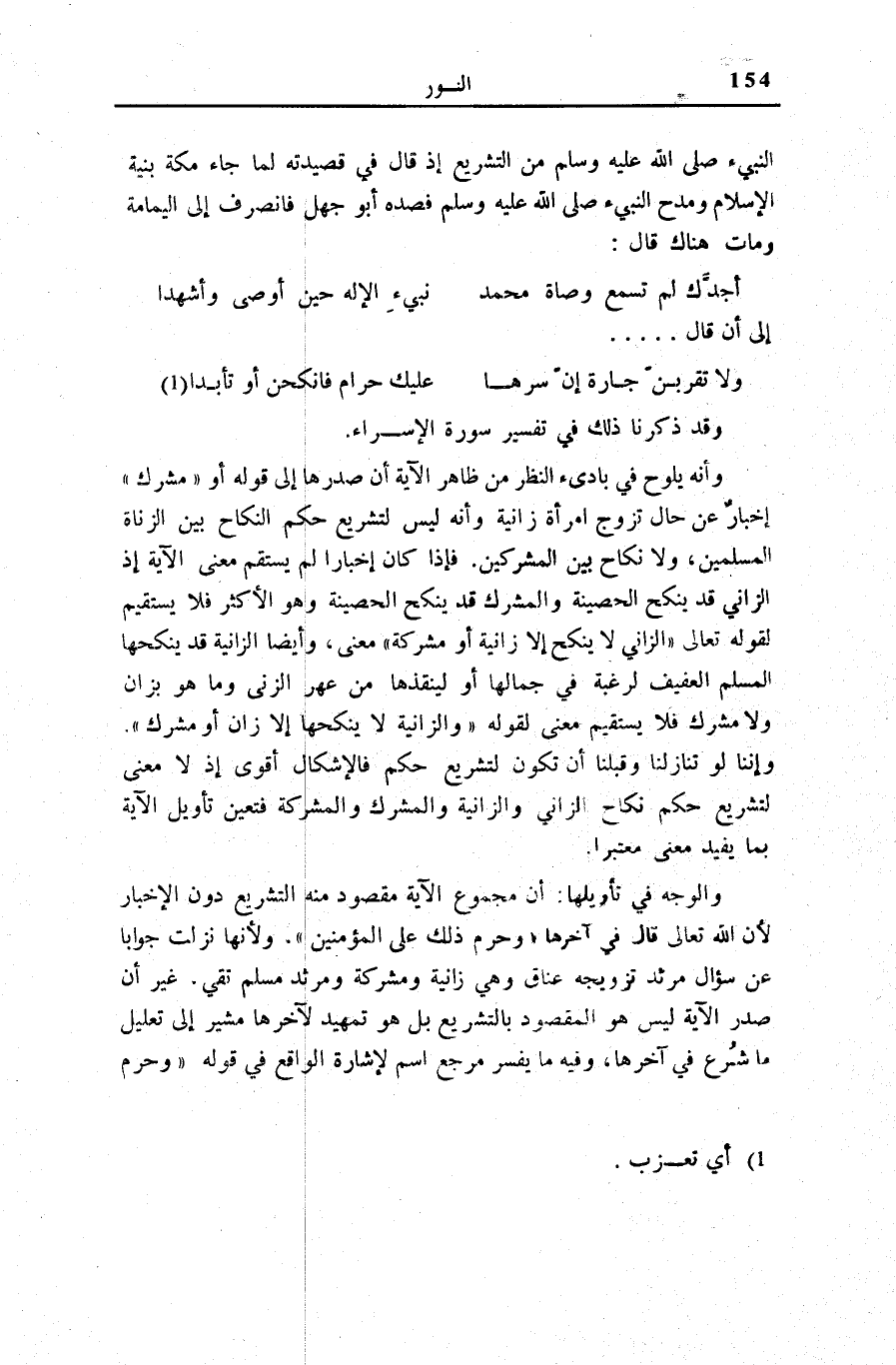 وَإِنَّهُ يلوح فِي بادىء النَّظَرِ مِنْ ظَاهِرِ الْآيَةِ أَنَّ صَدْرَهَا إِلَى قَوْلِهِ أَوْ مُشْرِكٌ إِخْبَارٌ عَنْ حَالِ تَزَوُّجِ امْرَأَةٍ زَانِيَةٍ وَأَنَّهُ لَيْسَ لِتَشْرِيعِ حُكْمِ النِّكَاحِ بَيْنَ الزُّنَاةِ الْمُسْلِمِينَ، وَلَا نِكَاحَ بَيْنَ الْمُشْرِكِينَ. فَإِذَا كَانَ إِخْبَارًا لَمْ يَسْتَقِمْ مَعْنَى الْآيَةِ إِذِ الزَّانِي قَدْ يَنْكِحُ الْحَصِينَةَ وَالْمُشْرِكُ قَدْ يَنْكِحُ الْحَصِينَةَ وَهُوَ الْأَكْثَرُ فَلَا يَسْتَقِيمُ لِقَوْلِهِ تَعَالَى: الزَّانِي لَا يَنْكِحُ إِلَّا زانِيَةً أَوْ مُشْرِكَةً مَعْنًى، وَأَيْضًا الزَّانِيَةُ قَدْ يَنْكِحُهَا الْمُسْلِمُ الْعَفِيفُ لِرَغْبَةٍ فِي جَمَالِهَا أَوْ لِيُنْقِذَهَا مِنْ عُهْرِ الزِّنَى وَمَا هُوَ بِزَانٍ وَلَا مُشْرِكٍ فَلَا يَسْتَقِيمُ مَعْنًى لِقَوْلِهِ: وَالزَّانِيَةُ لَا يَنْكِحُها إِلَّا زانٍ أَوْ مُشْرِكٌ وَإِنَّنَا لَوْ تَنَازَلْنَا وَقَبِلْنَا أَنْ تَكُونَ لِتَشْرِيعِ حُكْمٍ فَالْإِشْكَالُ أَقْوَى إِذْ لَا مَعْنَى لِتَشْرِيعِ حُكْمِ نِكَاحِ الزَّانِي وَالزَّانِيَةِ وَالْمُشْرِكِ وَالْمُشْرِكَةِ فَتَعَيَّنَ تَأْوِيلُ الْآيَةِ بِمَا يُفِيدُ مَعْنًى مُعْتَبَرًا.