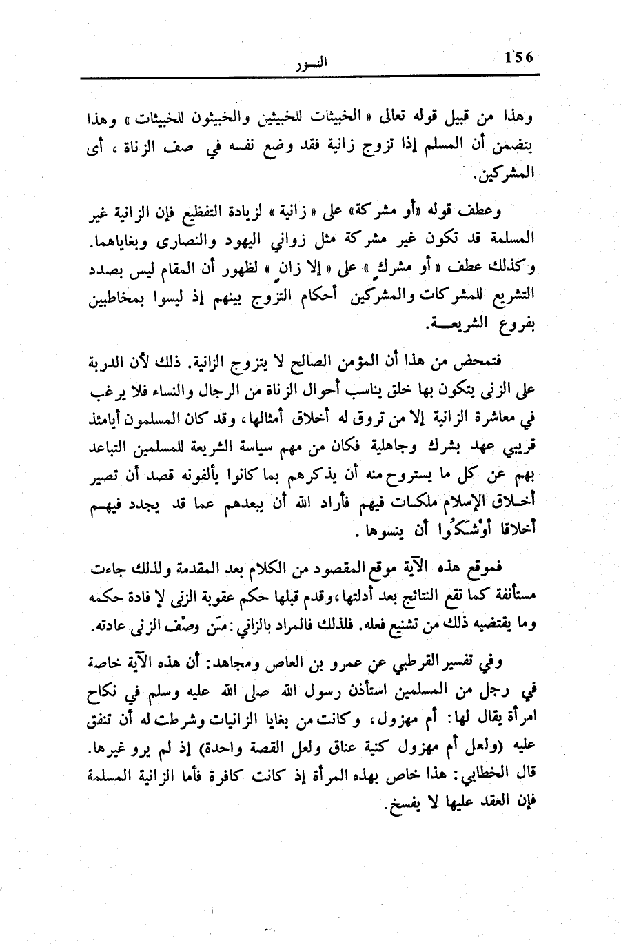 وَعُطِفَ قَوْلُهُ: أَوْ مُشْرِكَةً عَلَى زانِيَةً لِزِيَادَةِ التَّفْظِيعِ فَإِنَّ الزَّانِيَةَ غَيْرَ الْمُسْلِمَةِ قَدْ تَكُونُ غَيْرَ مُشْرِكَةٍ مِثْلَ زَوَانِي الْيَهُودِ وَالنَّصَارَى وَبَغَايَاهُمَا. وَكَذَلِكَ عُطِفَ أَوْ مُشْرِكٌ عَلَى إِلَّا زانٍ لِظُهُورِ أَنَّ الْمَقَامَ لَيْسَ بِصَدَدِ التَّشْرِيعِ لِلْمُشْرِكَاتِ وَالْمُشْرِكِينَ أَحْكَامَ التَّزَوُّجِ بَيْنَهُمْ إِذْ لَيْسُوا بِمُخَاطَبِينَ بِفُرُوعِ الشَّرِيعَةِ.
