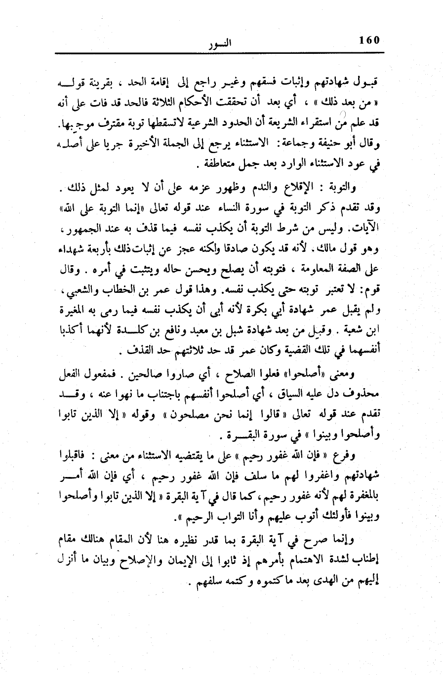 قَبُولِ شَهَادَتِهِمْ وَإِثْبَاتِ فِسْقِهِمْ وَغَيْرُ رَاجِعٍ إِلَى إِقَامَةِ الْحَدِّ، بِقَرِينَةِ قَوْلِهِ: مِنْ بَعْدِ ذلِكَ، أَيْ بَعْدَ أَنْ تَحَقَّقَتِ الْأَحْكَامُ الثَّلَاثَةُ فَالْحَدُّ قَدْ فَاتَ عَلَى أَنَّهُ قَدْ عُلِمَ مِنَ اسْتِقْرَاءِ الشَّرِيعَةِ أَنَّ الْحُدُودَ الشَّرْعِيَّةَ لَا تُسْقِطُهَا تَوْبَةُ مُقْتَرِفِ مُوجِبِهَا وَقَالَ أَبُو حَنِيفَةَ وَجَمَاعَةٌ: الِاسْتِثْنَاءُ يَرْجِعُ إِلَى الْجُمْلَةِ الْأَخِيرَةِ جَرْيًا عَلَى أَصْلِهِ فِي عَوْدِ الِاسْتِثْنَاءِ الْوَارِدِ بَعْدَ جُمَلٍ مُتَعَاطِفَةٍ.