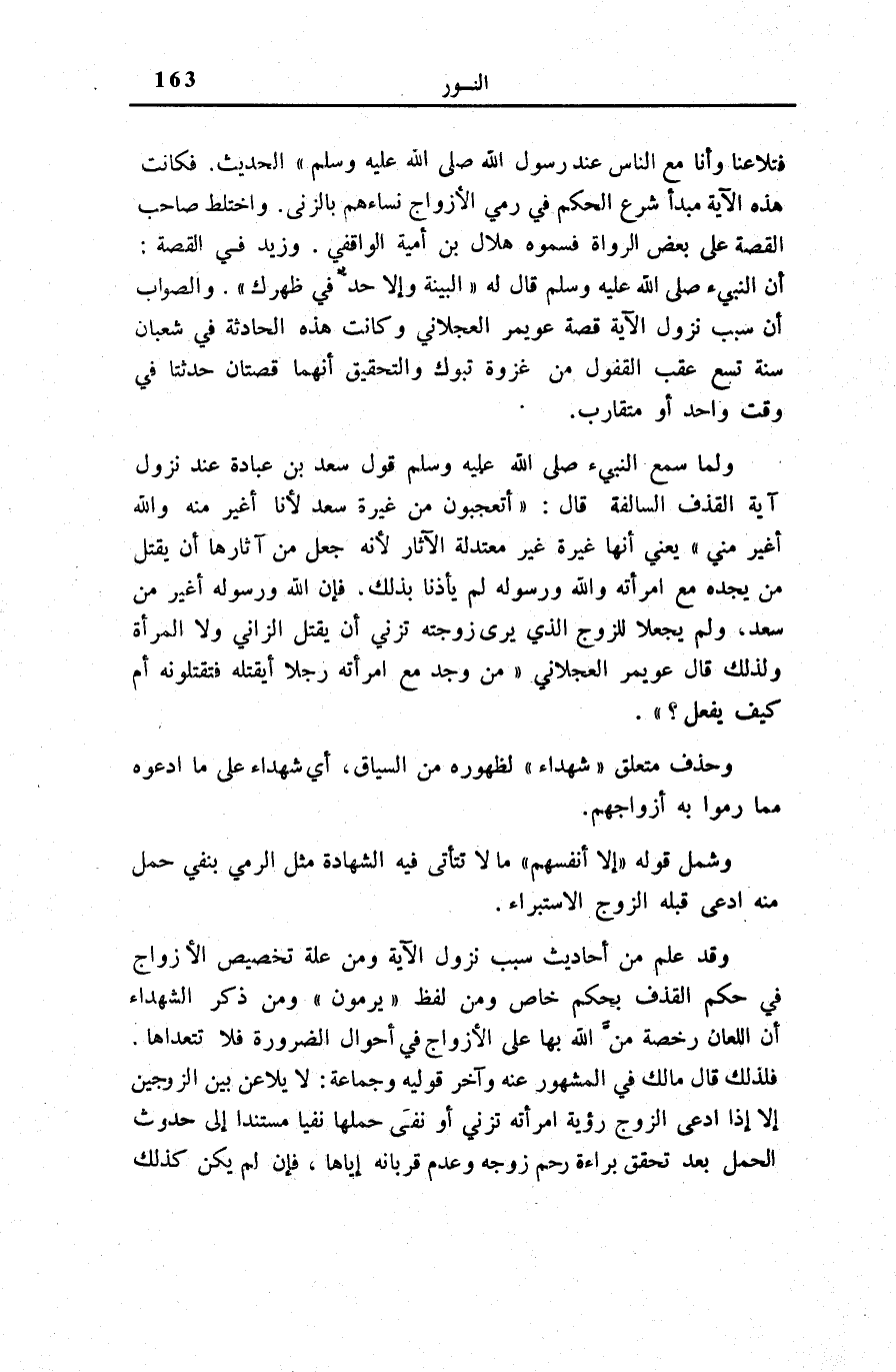 الْحَدِيثَ. فَكَانَتْ هَذِهِ الْآيَةُ مَبْدَأَ شَرْعِ الْحُكْمِ فِي رَمْيِ الْأَزْوَاجِ نِسَاءَهُمْ بِالزِّنَى. وَاخْتَلَطَ صَاحِبُ الْقِصَّةِ عَلَى بَعْضِ الرُّوَاةِ فَسَمَّوْهُ هِلَالَ ابْن أُمَيَّةَ الْوَاقِفِيَّ. وَزِيدَ فِي الْقِصَّةِ: