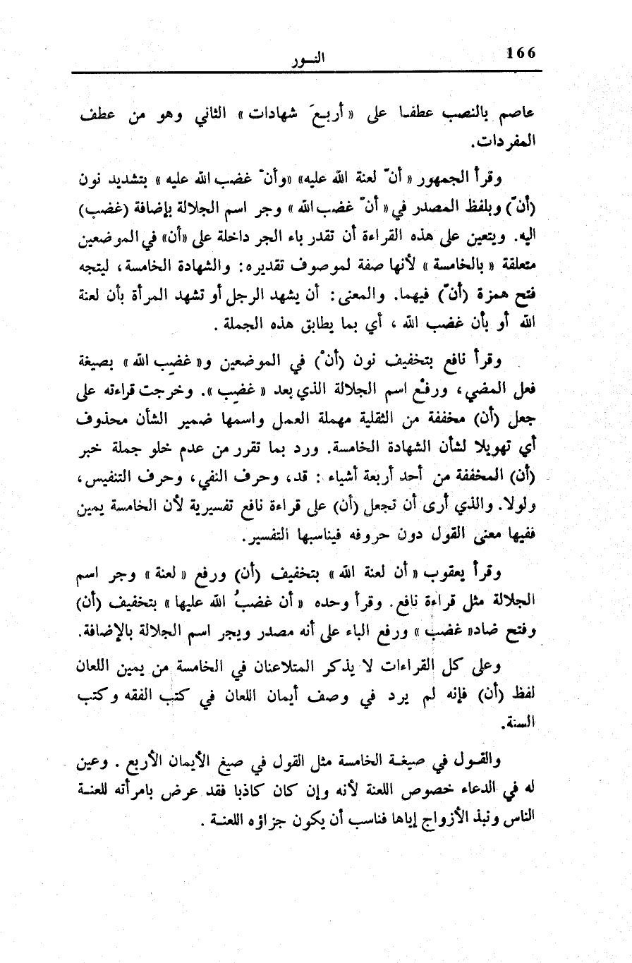وَقَرَأَ الْجُمْهُور: أَنَّ لَعْنَتَ اللَّهِ عَلَيْهِ وأَنَّ غَضَبَ اللَّهِ عَلَيْها بِتَشْدِيدِ نُونِ (أَنَّ) وبلفظ الْمصدر فِي أَنَّ غَضَبَ اللَّهِ وَجَرِّ اسْمِ الْجَلَالَةِ بِإِضَافَةِ (غَضَبَ) إِلَيْهِ. وَيَتَعَيَّنُ عَلَى هَذِهِ الْقِرَاءَةِ أَنْ تُقَدَّرَ بَاءُ الْجَرِّ دَاخِلَةً عَلَى أَنَّ فِي الْمَوْضِعَيْنِ مُتَعَلقَة ب الْخامِسَةُ لِأَنَّهَا صِفَةٌ لِمَوْصُوفٍ تَقْدِيرُهُ: وَالشَّهَادَةُ الْخَامِسَةُ، لِيَتَّجِهَ فَتْحُ هَمْزَةِ (أَنَّ) فِيهِمَا. وَالْمَعْنَى: أَنْ يَشْهَدَ الرَّجُلُ أَوْ تَشْهَدَ الْمَرْأَةُ بِأَنَّ لَعْنَةَ اللَّهِ أَوْ بِأَنَّ غَضَبَ اللَّهِ، أَيْ بِمَا يُطَابِقُ هَذِهِ الْجُمْلَةَ.