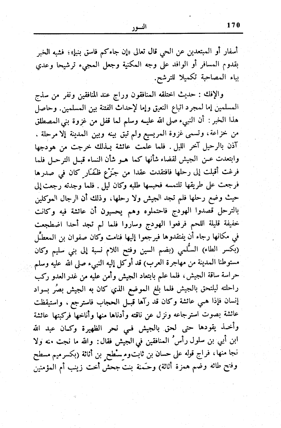 وَالْإِفْكُ: حَدِيثٌ اخْتَلَقَهُ الْمُنَافِقُونَ وَرَاجَ عِنْدَ الْمُنَافِقِينَ وَنَفَرٍ مِنْ سُذَّجِ الْمُسْلِمِينَ إِمَّا لِمُجَرَّدِ اتِّبَاعِ النَّعِيقِ وَإِمَّا لِإِحْدَاثِ الْفِتْنَةِ بَيْنَ الْمُسْلِمِينَ. وَحَاصِلُ هَذَا الْخَبَرِ: أَن النبيء صَلَّى اللهُ عَلَيْهِ وَسَلَّمَ لَمَّا قَفَلَ مِنْ غَزْوَةِ بَنِي الْمُصْطَلِقِ مِنْ خُزَاعَةَ، وَتُسَمَّى غَزْوَةَ الْمُرَيْسِيعِ وَلَمْ تَبْقَ بَيْنَهُ وَبَيْنَ الْمَدِينَةِ إِلَّا مَرْحَلَةٌ. آذَنَ بِالرَّحِيلِ آخِرَ اللَّيْلِ. فَلَمَّا عَلِمَتْ عَائِشَةُ بِذَلِكَ خَرَجَتْ مِنْ هَوْدَجِهَا وَابْتَعَدَتْ عَنِ الْجَيْشِ لِقَضَاءِ شَأْنِهَا كَمَا هُوَ شَأْنُ النِّسَاءِ قَبْلَ التَّرَحُّلِ فَلَمَّا فَرَغَتْ أَقْبَلَتْ إِلَى رَحْلِهَا فَافْتَقَدَتْ عِقْدًا مِنْ جَزْعِ ظَفَارٍ كَانَ فِي صَدْرِهَا فَرَجَعَتْ عَلَى طَرِيقِهَا تَلْتَمِسُهُ فَحَبَسَهَا طَلَبُهُ وَكَانَ لَيْلٌ. فَلَمَّا وَجَدَتْهُ رَجَعَتْ إِلَى حَيْثُ وُضِعَ رَحْلُهَا فَلَمْ تَجِدِ الْجَيْشَ وَلَا رَحْلَهَا، وَذَلِكَ أَنَّ الرِّجَالَ الْمُوَكَّلِينَ بِالتَّرَحُّلِ قَصَدُوا الْهَوْدَجَ فَاحْتَمَلُوهُ وَهُمْ يَحْسَبُونَ أَنَّ عَائِشَةَ فِيهِ وَكَانَتْ خَفِيفَةً قَلِيلَةَ اللَّحْمِ فَرَفَعُوا الْهَوْدَجَ وَسَارُوا فَلَمَّا لَمْ تَجِدْ أَحَدًا اضْطَجَعَتْ فِي مَكَانِهَا رَجَاءَ أَنْ يَفْتَقِدُوهَا فَيَرْجِعُوا إِلَيْهَا فَنَامَتْ وَكَانَ صَفْوَانُ بْنُ الْمُعَطِّلِ (بِكَسْرِ الطَّاءِ) السُّلَمِيُّ