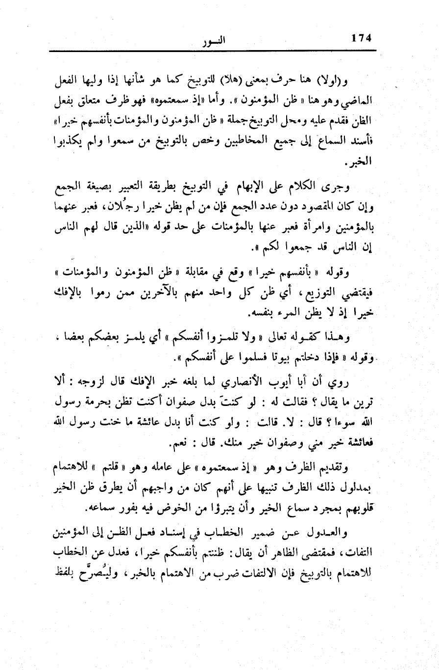 وَ (لَوْلا) هُنَا حَرْفٌ بِمَعْنَى (هَلَّا) لِلتَّوْبِيخِ كَمَا هُوَ شَأْنُهَا إِذَا وَلِيَهَا الْفِعْلُ الْمَاضِي وَهُوَ هُنَا ظَنَّ الْمُؤْمِنُونَ. وَأَمَّا إِذْ سَمِعْتُمُوهُ فَهُوَ ظَرْفٌ مُتَعَلِّقٌ بِفِعْلِ الظَّنِّ فَقُدِّمَ عَلَيْهِ وَمَحَلُّ التَّوْبِيخِ جُمْلَةُ: ظَنَّ الْمُؤْمِنُونَ وَالْمُؤْمِناتُ بِأَنْفُسِهِمْ خَيْراً فَأَسْنَدَ السَّمَاعَ إِلَى جَمِيعِ الْمُخَاطَبِينَ وَخَصَّ بِالتَّوْبِيخِ مَنْ سَمِعُوا وَلَمْ يُكَذِّبُوا الْخَبَرَ.