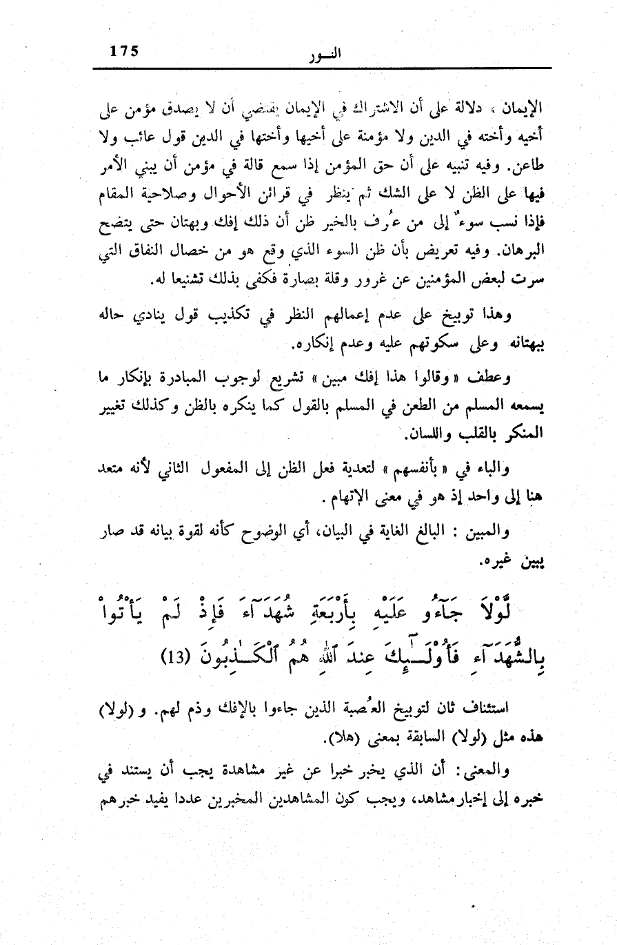 لَوْلا جاؤُ عَلَيْهِ بِأَرْبَعَةِ شُهَداءَ فَإِذْ لَمْ يَأْتُوا بِالشُّهَداءِ فَأُولئِكَ عِنْدَ اللَّهِ هُمُ الْكاذِبُونَ (13)