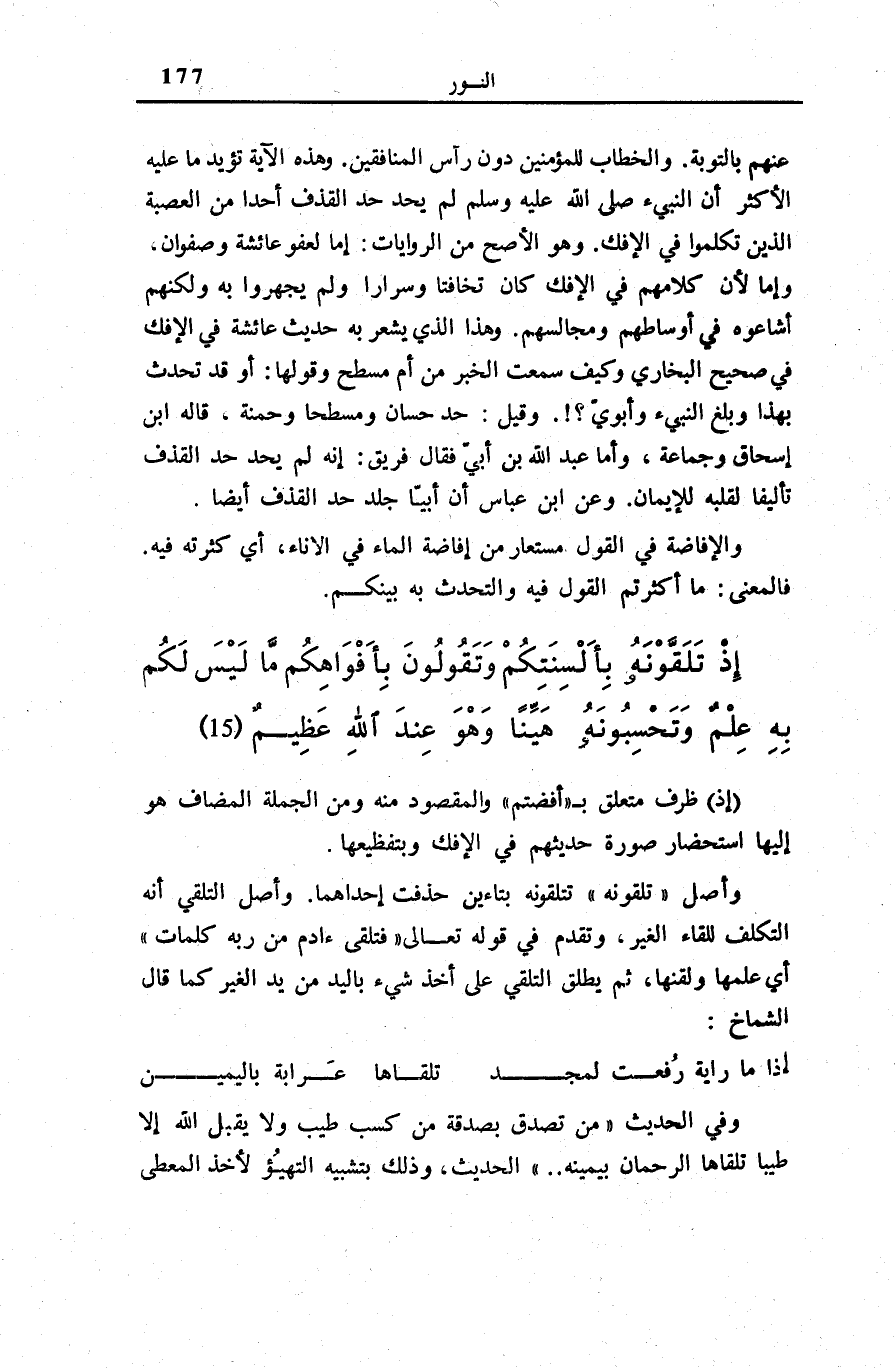 إِذْ تَلَقَّوْنَهُ بِأَلْسِنَتِكُمْ وَتَقُولُونَ بِأَفْواهِكُمْ مَا لَيْسَ لَكُمْ بِهِ عِلْمٌ وَتَحْسَبُونَهُ هَيِّناً وَهُوَ عِنْدَ اللَّهِ عَظِيمٌ (15)