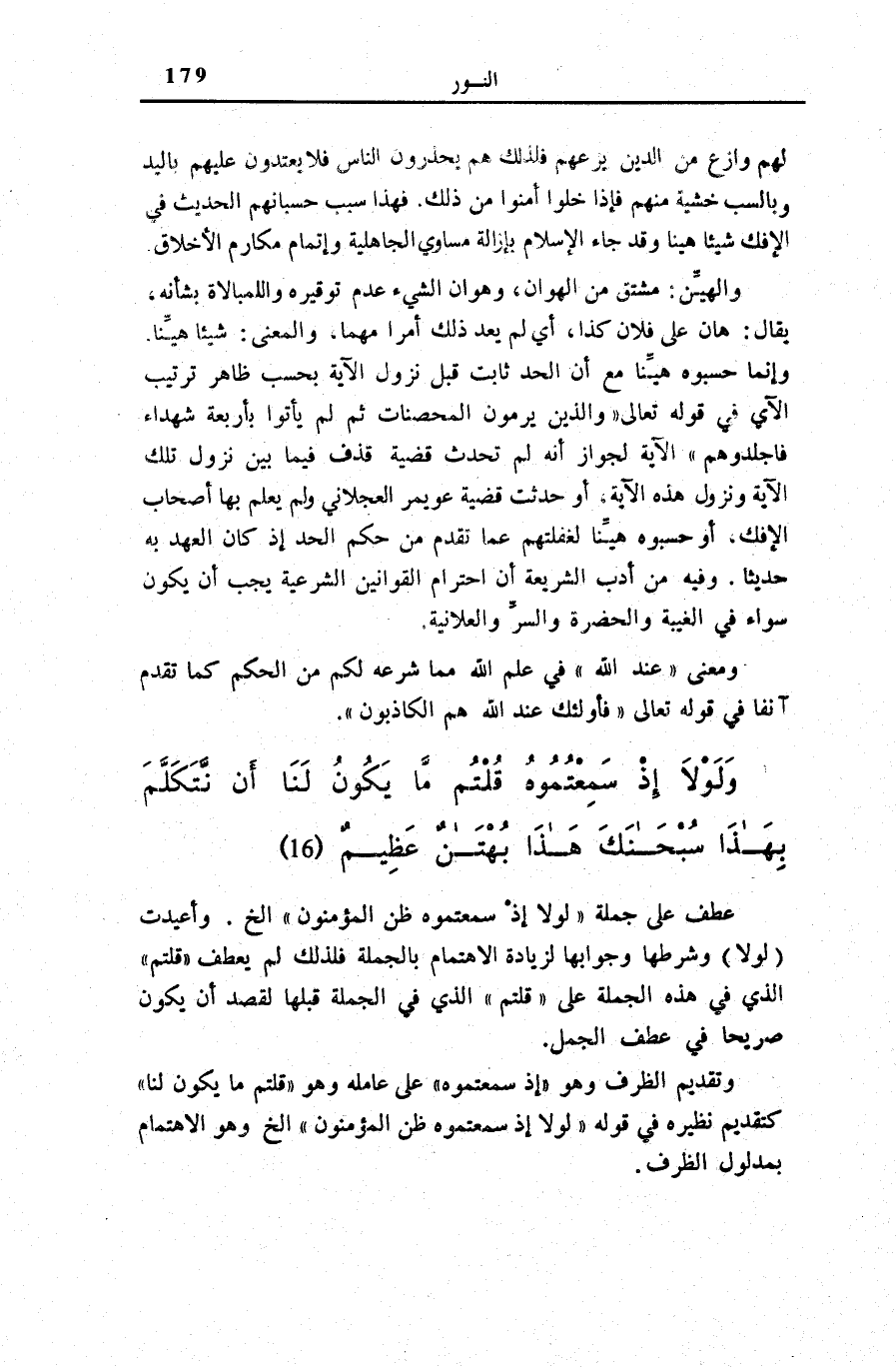 وَلَوْلا إِذْ سَمِعْتُمُوهُ قُلْتُمْ مَا يَكُونُ لَنا أَنْ نَتَكَلَّمَ بِهذا سُبْحانَكَ هَذَا بُهْتانٌ عَظِيمٌ (16)