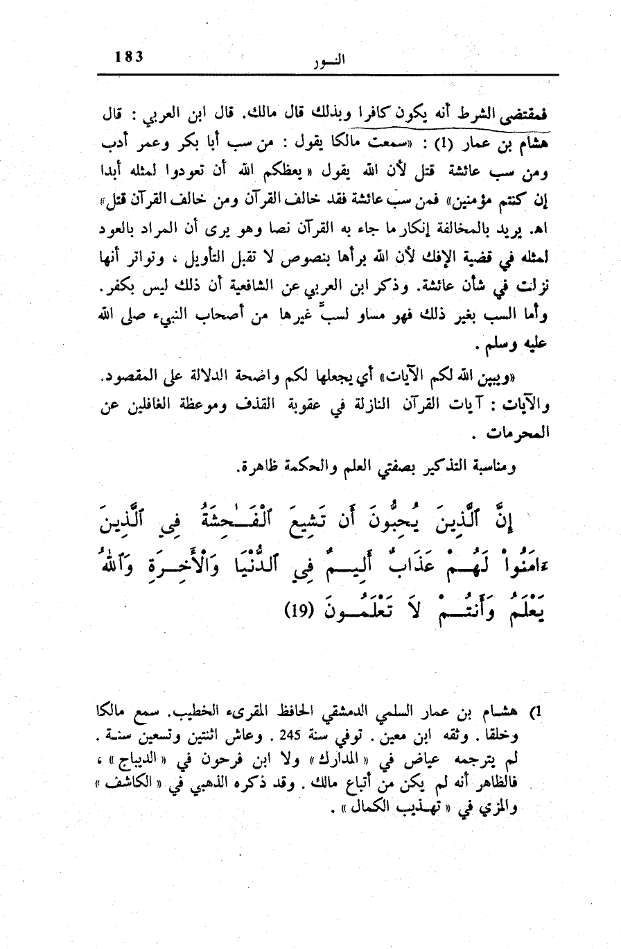 فَمُقْتَضَى الشَّرْطِ أَنَّهُ يَكُونُ كَافِرًا وَبِذَلِكَ قَالَ مَالِكٌ. قَالَ ابْنُ الْعَرَبِيِّ: قَالَ هِشَامُ بْنُ عَمَّارٍ (¬1) : «سَمِعْتُ مَالِكًا يَقُولُ: مَنْ سَبَّ أَبَا بَكْرٍ وَعُمَرَ أُدِّبَ، وَمَنْ سَبَّ عَائِشَةَ قُتِلَ لِأَنَّ اللَّهَ يَقُولُ: يَعِظُكُمُ اللَّهُ أَنْ تَعُودُوا لِمِثْلِهِ أَبَداً إِنْ كُنْتُمْ مُؤْمِنِينَ فَمَنْ سَبٍّ عَائِشَةَ فَقَدْ خَالَفَ الْقُرْآنَ وَمَنْ خَالَفَ الْقُرْآنَ قُتِلَ» اهـ. يُرِيدُ بِالْمُخَالَفَةِ إِنْكَارَ مَا جَاءَ بِهِ الْقُرْآنُ نَصًّا وَهُوَ يَرَى أَنَّ الْمُرَادَ بِالْعَوْدِ لِمِثْلِهِ فِي قَضِيَّةِ الْإِفْكِ لِأَنَّ اللَّهَ بَرَّأَهَا بِنُصُوصٍ لَا تَقْبَلُ التَّأْوِيلَ، وَتَوَاتَرَ أَنَّهَا نَزَلَتْ فِي شَأْنِ عَائِشَةَ. وَذَكَرَ ابْنُ الْعَرَبِيِّ عَنِ الشَّافِعِيَّةِ أَنَّ ذَلِكَ لَيْسَ بِكُفْرٍ. وَأَمَّا السَّبُّ بِغَيْرِ ذَلِكَ فَهُوَ مُسَاوٍ لِسَبِّ غَيْرِهَا مِنْ أَصْحَاب النبيء صَلَّى اللهُ عَلَيْهِ وَسَلَّمَ.