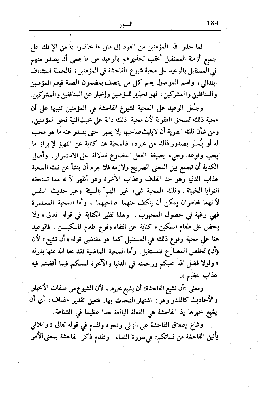 وَمَعْنَى: أَنْ تَشِيعَ الْفاحِشَةُ أَنْ يَشِيعَ خَبَرُهَا، لِأَنَّ الشُّيُوعَ مِنْ صِفَاتِ الْأَخْبَارِ وَالْأَحَادِيثِ كَالْفُشُوِّ وَهُوَ: اشْتِهَارُ التَّحَدُّثِ بِهَا. فَتَعَيَّنَ تَقْدِيرُ مُضَافٍ، أَيْ أَنْ يَشِيعَ خَبَرُهَا إِذِ الْفَاحِشَةُ هِيَ الْفَعْلَةُ الْبَالِغَةُ حَدًّا عَظِيمًا فِي الشَّنَاعَةِ.