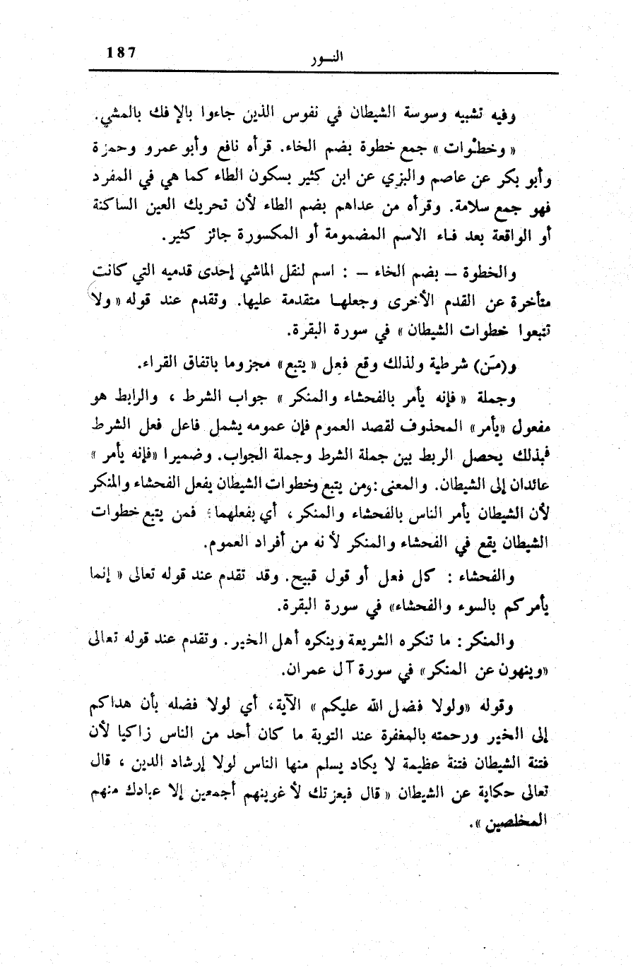 وَقَوْلُهُ: وَلَوْلا فَضْلُ اللَّهِ عَلَيْكُمْ الْآيَةَ، أَيْ لَوْلَا فَضْلُهُ بِأَنْ هَدَاكُمْ إِلَى الْخَيْرِ وَرَحْمَتُهُ بِالْمَغْفِرَةِ عِنْدَ التَّوْبَةِ مَا كَانَ أَحَدٌ مِنَ النَّاسِ زَاكِيًا لِأَنَّ فتْنَة الشَّيْطَان فِتْنَةَ عَظِيمَةٌ لَا يَكَادُ يَسْلَمُ مِنْهَا النَّاسُ لَوْلَا إِرْشَادُ الدِّينِ، قَالَ تَعَالَى حِكَايَةً عَنِ الشَّيْطَانِ قالَ فَبِعِزَّتِكَ لَأُغْوِيَنَّهُمْ أَجْمَعِينَ إِلَّا عِبادَكَ مِنْهُمُ الْمُخْلَصِينَ [ص: 82، 83] .