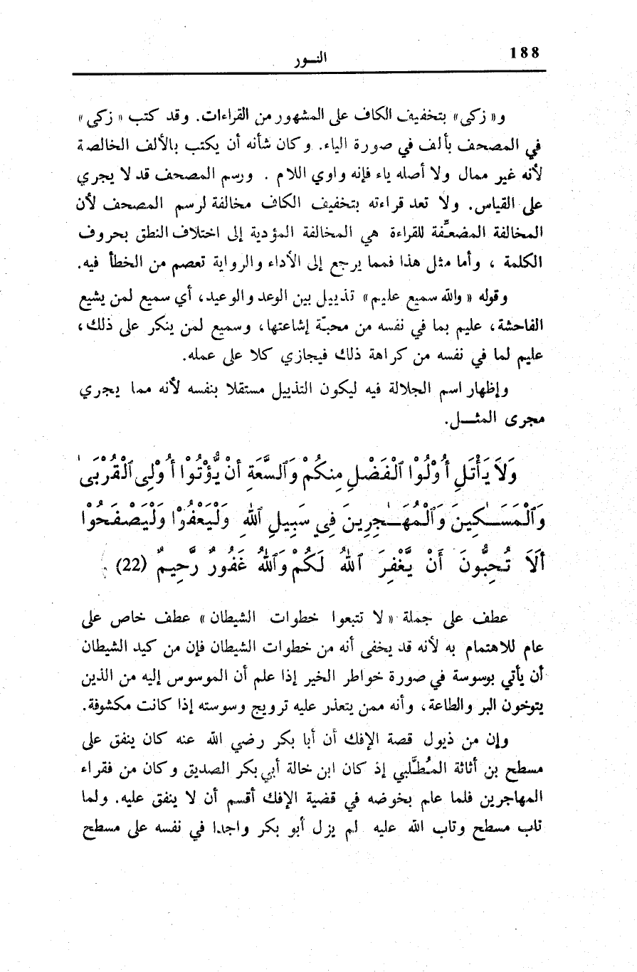 وَلا يَأْتَلِ أُولُوا الْفَضْلِ مِنْكُمْ وَالسَّعَةِ أَنْ يُؤْتُوا أُولِي الْقُرْبى وَالْمَساكِينَ وَالْمُهاجِرِينَ فِي سَبِيلِ اللَّهِ وَلْيَعْفُوا وَلْيَصْفَحُوا أَلا تُحِبُّونَ أَنْ يَغْفِرَ اللَّهُ لَكُمْ وَاللَّهُ غَفُورٌ رَحِيمٌ (22)