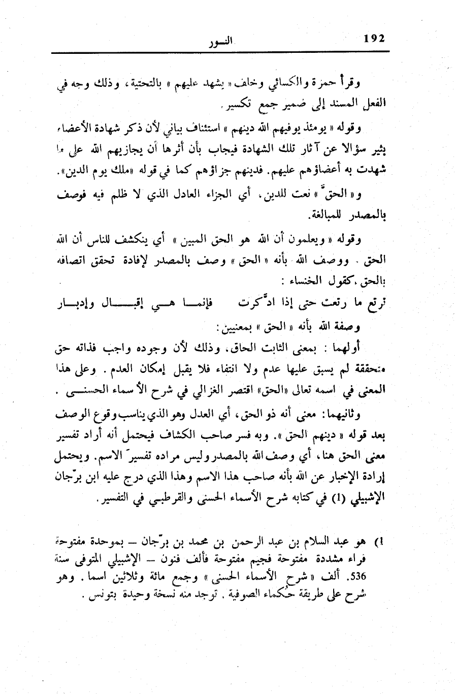 دِينَهُمُ الْحَقَّ. وَبِهِ فَسَّرَ صَاحِبُ «الْكَشَّافِ» فَيُحْتَمَلُ أَنَّهُ أَرَادَ تَفْسِيرَ مَعْنَى الْحَقِّ هُنَا، أَيْ وَصْفَ اللَّهِ بِالْمَصْدَرِ وَلَيْسَ مُرَادُهُ تَفْسِير الِاسْم. وَيحْتَمل إِرَادَة الْإِخْبَار عَن الله بِأَنَّهُ صَاحب هَذَا الِاسْمِ وَهَذَا الَّذِي دَرَجَ عَلَيْهِ ابْنُ بَرَّجَانَ الْإِشْبِيلِيُّ (¬1) فِي كِتَابِهِ «شَرْحِ الْأَسْمَاءِ الْحُسْنَى» وَالْقُرْطُبِيُّ فِي «التَّفْسِيرِ» .