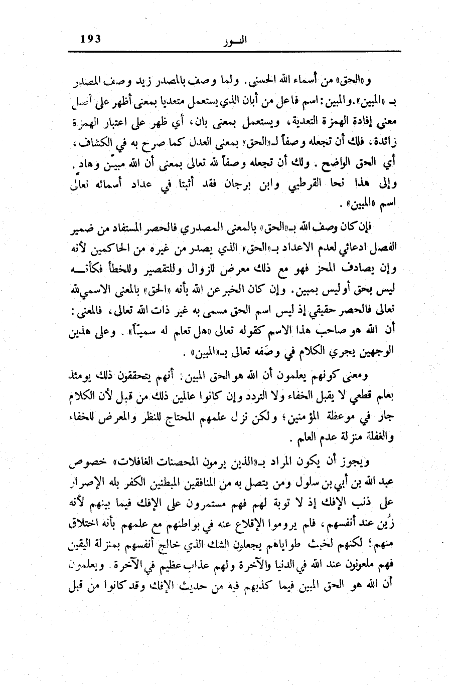 وَ (الْحَقُّ) مِنْ أَسْمَاءِ اللَّهِ الْحُسْنَى. وَلَمَّا وُصِفَ بِالْمَصْدَرِ زِيدَ وَصْفُ الْمَصْدَرِ بِ الْمُبِينُ. وَالْمُبِينُ: اسْمُ فَاعِلٍ مِنْ أَبَانَ الَّذِي يُسْتَعْمَلُ مُتَعَدِّيًا بِمَعْنَى أَظْهَرَ عَلَى أَصْلِ مَعْنَى إِفَادَةِ الْهَمْزَةِ التَّعْدِيَةَ، وَيُسْتَعْمَلُ بِمَعْنَى بَانَ، أَيْ ظَهَرَ عَلَى اعْتِبَارِ الْهَمْزَةِ زَائِدَةٌ، فَلَكَ أَنْ تَجْعَلَهُ وَصْفًا لِ الْحَقَّ بِمَعْنَى الْعَدْلِ كَمَا صرح بِهِ فِي «الْكَشَّافُ» ، أَيْ الْحَقُّ الْوَاضِحُ.