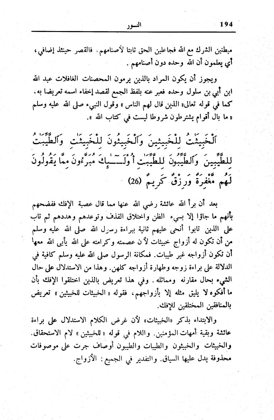 وَالِابْتِدَاءُ بِذِكْرِ الْخَبِيثاتُ لِأَنَّ غَرَضَ الْكَلَامِ الِاسْتِدْلَالُ عَلَى بَرَاءَةِ عَائِشَةَ وَبَقِيَّةِ أُمَّهَاتِ الْمُؤْمِنِينَ. وَاللَّامُ فِي قَوْلِهِ: لِلْخَبِيثِينَ لَامُ الِاسْتِحْقَاقِ. وَالْخَبِيثَاتُ وَالْخَبِيثُونَ وَالطَّيِّبَاتُ وَالطَّيِّبُونَ أَوْصَافٌ جَرَتْ عَلَى مَوْصُوفَاتٍ مَحْذُوفَةٍ يَدُلُّ عَلَيْهَا السِّيَاقُ. وَالتَّقْدِيرُ فِي الْجَمِيعِ: الْأَزْوَاجُ.