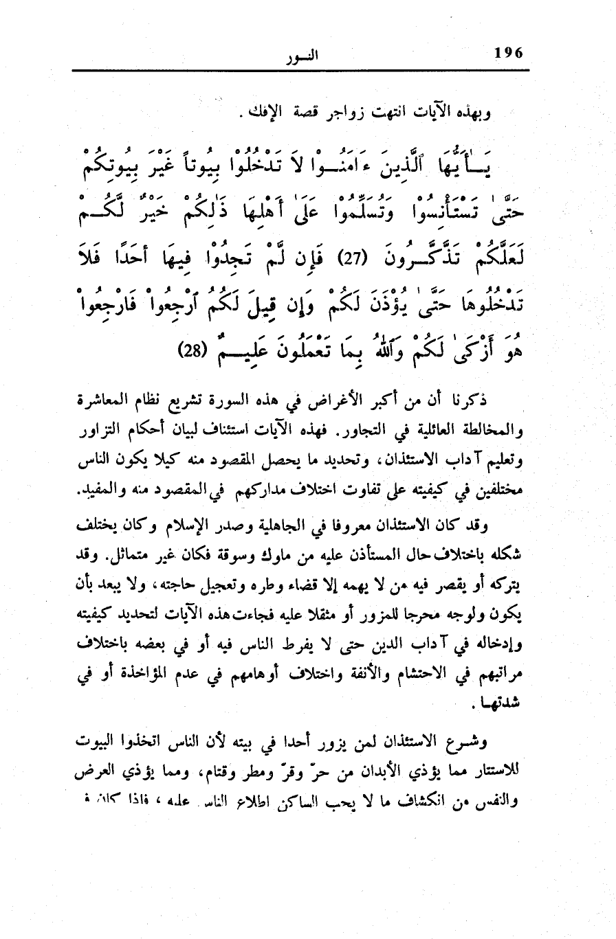 وَقَدْ كَانَ الِاسْتِئْذَانُ مَعْرُوفًا فِي الْجَاهِلِيَّةِ وَصَدْرِ الْإِسْلَامِ، وَكَانَ يَخْتَلِفُ شَكْلُهُ بِاخْتِلَافِ حَالِ الْمُسْتَأْذَنِ عَلَيْهِ مِنْ مُلُوكٍ وَسُوقَةٍ فَكَانَ غَيْرَ مُتَمَاثِلٍ. وَقَدْ يَتْرُكُهُ أَوْ يُقَصِّرُ فِيهِ مَنْ لَا يُهِمُّهُ إِلَّا قَضَاءُ وَطْرِهِ وَتَعْجِيلُ حَاجَتِهِ، وَلَا يَبْعُدُ بِأَنْ يَكُونَ وُلُوجُهُ مُحْرِجًا لِلْمَزُورِ أَوْ مُثْقِلًا عَلَيْهِ فَجَاءَتْ هَذِهِ الْآيَاتُ لِتَحْدِيدِ كَيْفِيَّتِهِ وَإِدْخَالِهِ فِي آدَابِ الدِّينِ حَتَّى لَا يُفَرِّطَ النَّاسُ فِيهِ أَوْ فِي بَعْضِهِ بِاخْتِلَافِ مَرَاتِبِهِمْ فِي الِاحْتِشَامِ وَالْأَنَفَةِ وَاخْتِلَافِ أَوْهَامِهِمْ فِي عَدَمِ الْمُؤَاخَذَةِ أَوْ فِي شِدَّتِهَا.