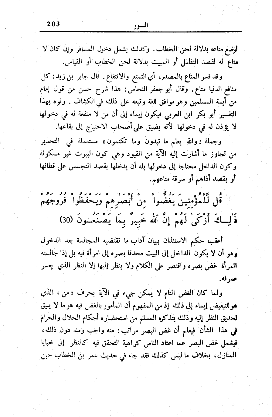 وَلَمَّا كَانَ الْغَضُّ التَّامُّ لَا يُمْكِنُ جِيءَ فِي الْآيَةِ بِحَرْفِ مِنْ الَّذِي هُوَ لِلتَّبْعِيضِ إِيمَاءٌ إِلَى ذَلِكَ إِذْ مِنَ الْمَفْهُومِ أَنَّ الْمَأْمُورَ بِالْغَضِّ فِيهِ هُوَ مَا لَا يَلِيقُ تَحْدِيقُ النَّظَرِ إِلَيْهِ وَذَلِكَ يَتَذَكَّرُهُ الْمُسْلِمُ مِنِ اسْتِحْضَارِهِ أَحْكَامَ الْحَلَالِ وَالْحَرَامِ فِي هَذَا الشَّأْنِ فَيَعْلَمُ أَنَّ غَضَّ الْبَصَرِ مَرَاتِبٌ: مِنْهُ وَاجِبٌ وَمِنْهُ دُونُ ذَلِكَ، فَيَشْمَلُ غَضُّ الْبَصَرِ عَمَّا اعْتَادَ النَّاسُ كَرَاهِيَةَ التَّحَقُّقِ فِيهِ كَالنَّظَرِ إِلَى خَبَايَا الْمَنَازِلِ، بِخِلَافِ مَا لَيْسَ كَذَلِكَ فَقَدْ
