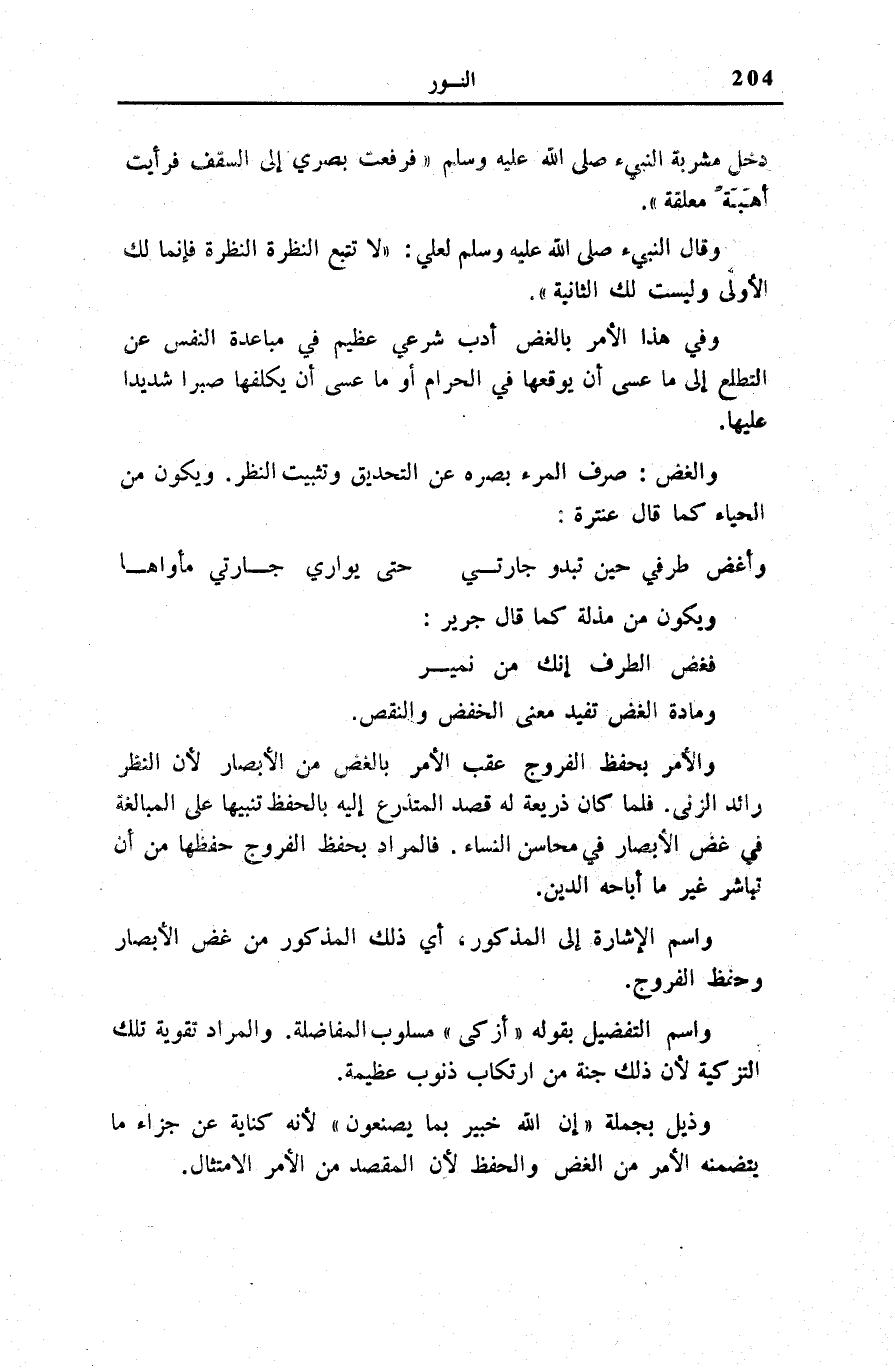 وَقَالَ النبيء صَلَّى اللهُ عَلَيْهِ وَسَلَّمَ لِعَلِيٍّ: «لَا تُتْبِعِ النَّظْرَةَ النَّظْرَةَ فَإِنَّمَا لَكَ الْأُولَى وَلَيْسَتْ لَكَ الثَّانِيَةُ»